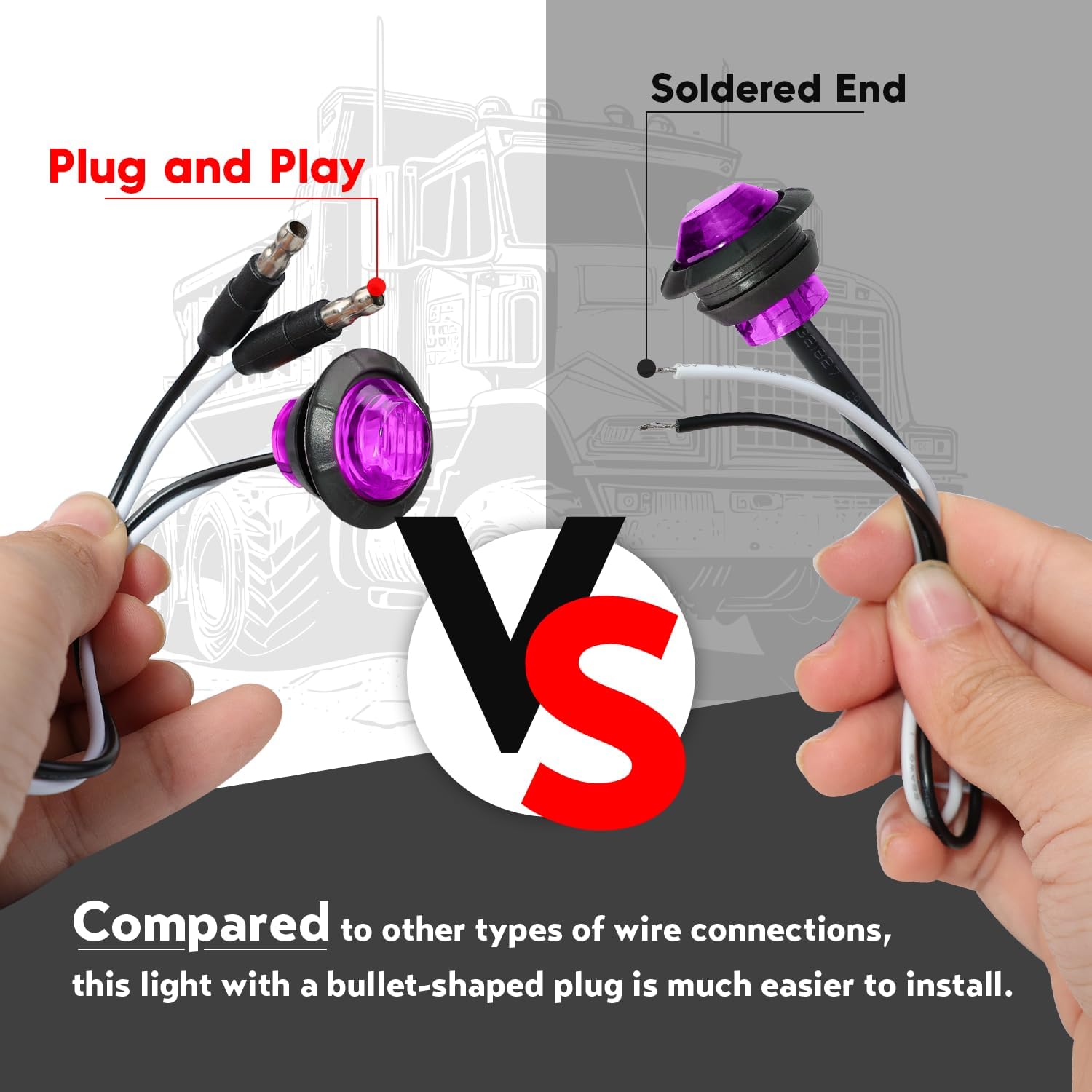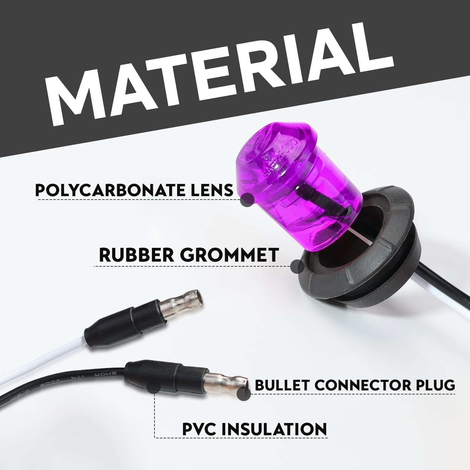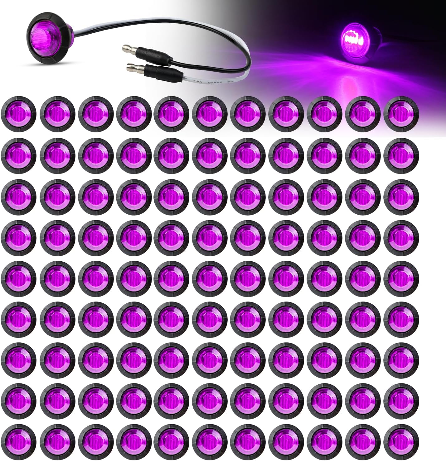 Package includes 3/4 inch “100 pcs purple light” bullet side markers lights and rubber grommets.