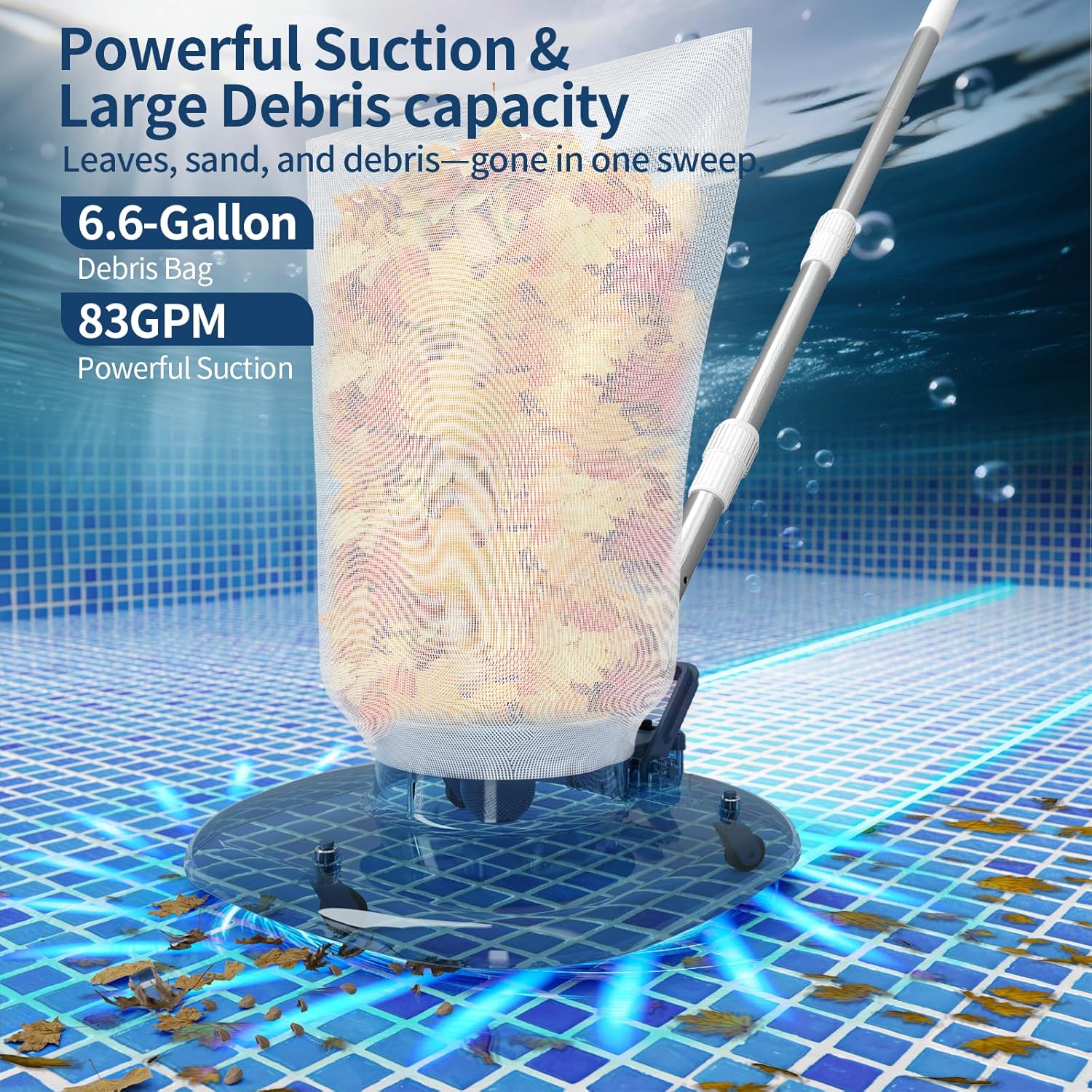 Cordless Pool Leaf Vacuum and Skimmer with Telescopic Pole, 83GPM Suction, Rechargeable