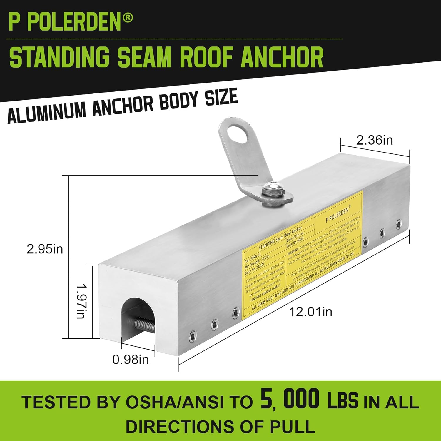 COMPONENTS: Standing seam roof anchor reusable safety clamp consists of a solid aluminum body with 12 stainless steel set screws.The standard assembly includes a 5,000 lbs. ANSI certified for single-worker attachment, with a 12.3\' body length and 4.7\' width