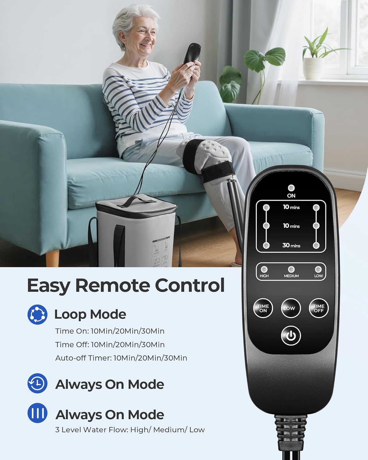 Remote Control Operation: Easily adjust 3 water flow levels and set customized work-rest cycles with the remote. Auto shut-off lets you relax worry-free. Enjoy personalized cold therapy without moving—comfort and control right at your fingertips