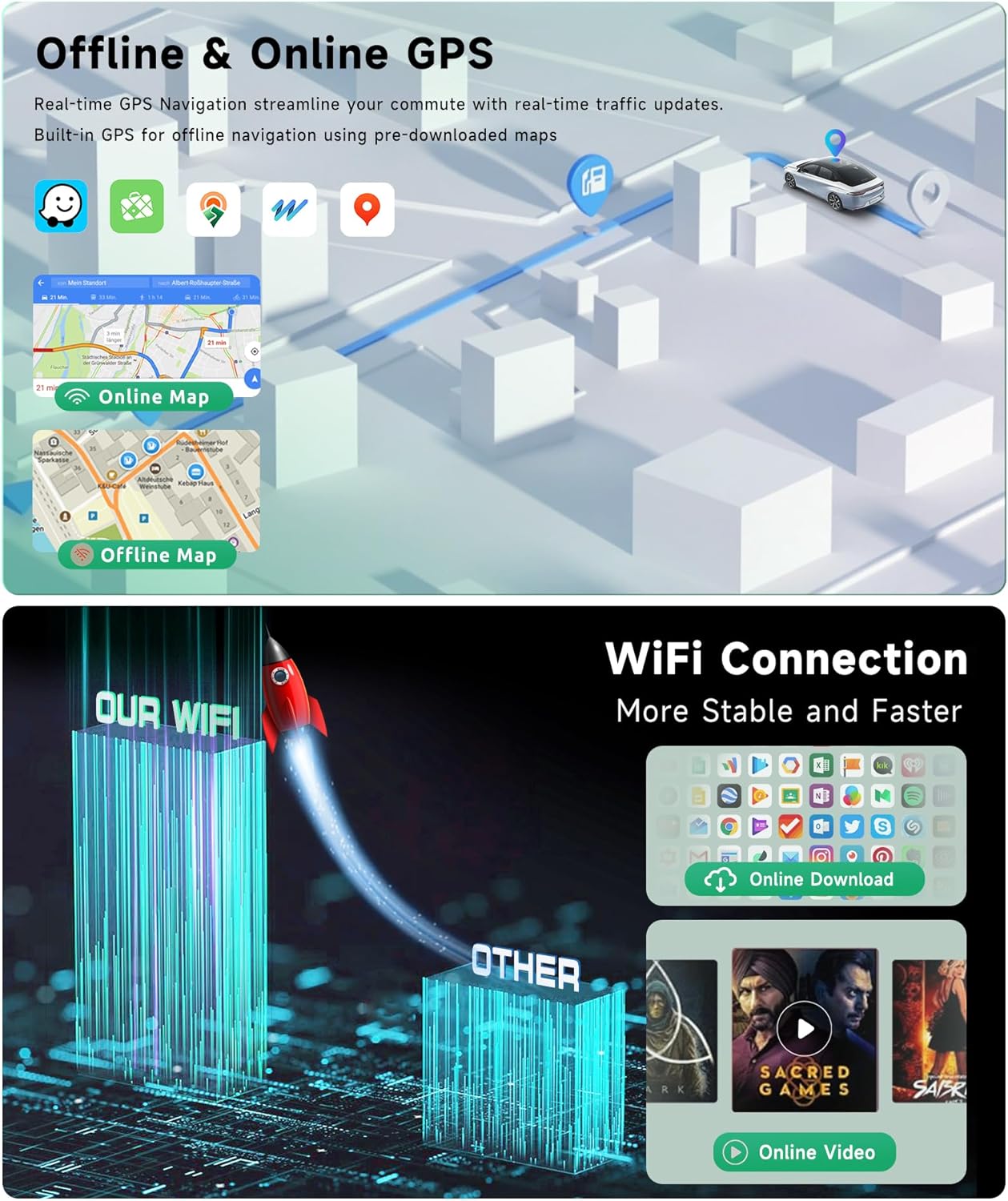2. Wireless CarPlay & Wireless Android Auto The car stereo supports wireless (Bluetooth) connections for CarPlay and Wireless Android Auto.Use apps like Waze, Spotify, YouTube Music, and Sirius-XM Radio on the touchscreen. Mirror Link enables car cinema via USB ((compatible with new iOS/Android