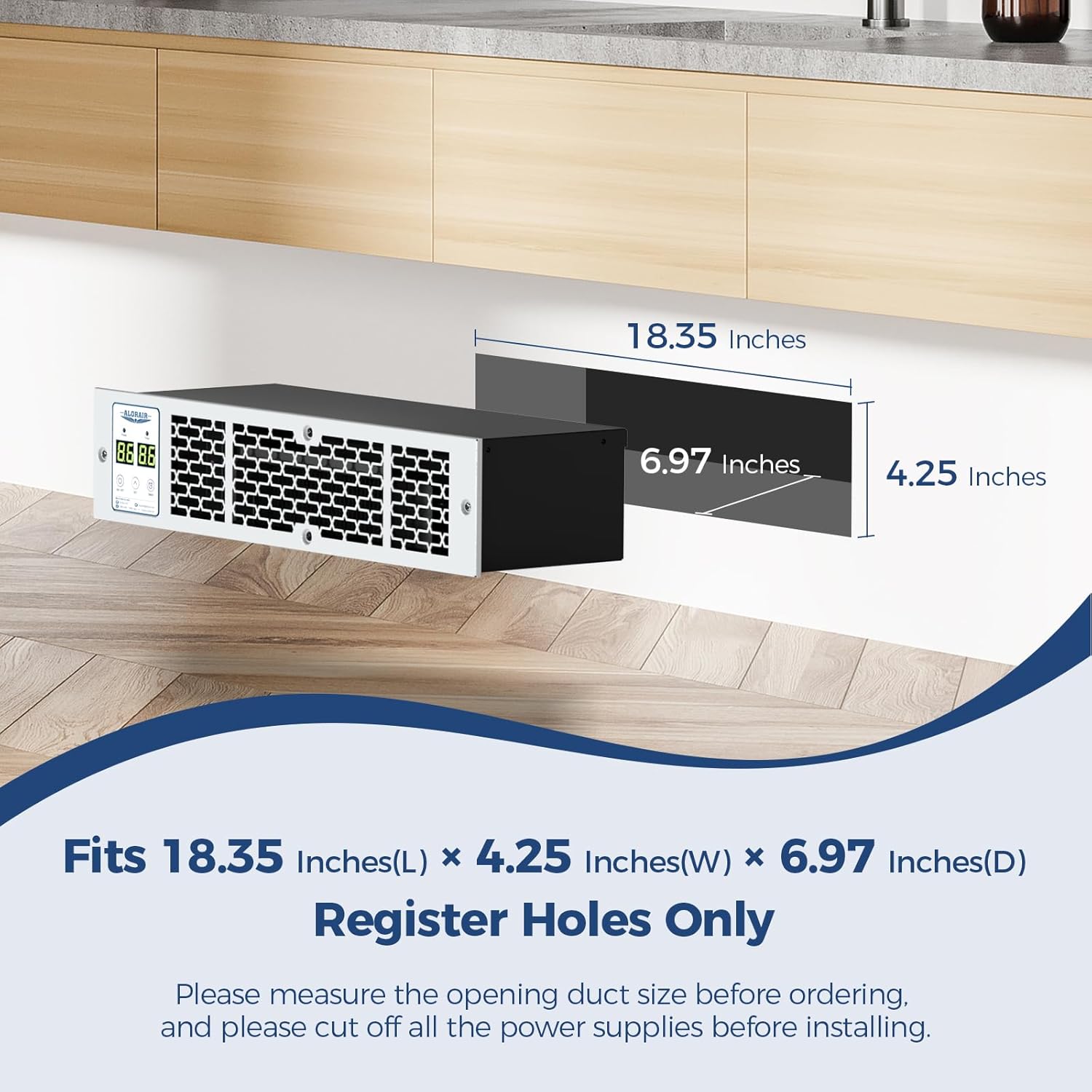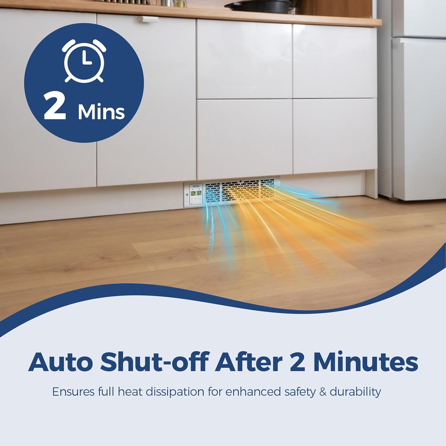 Rapid Heating with Professional-Grade Build: This 1350W electric wall heater features a high-efficiency 4520 BTU/h heating element and a 2769 RPM DC motor for stronger airflow and lower noise. With a 200mm extended blower and heating tube, this toe kick heater increases air volume and improves heating efficiency by 30%.