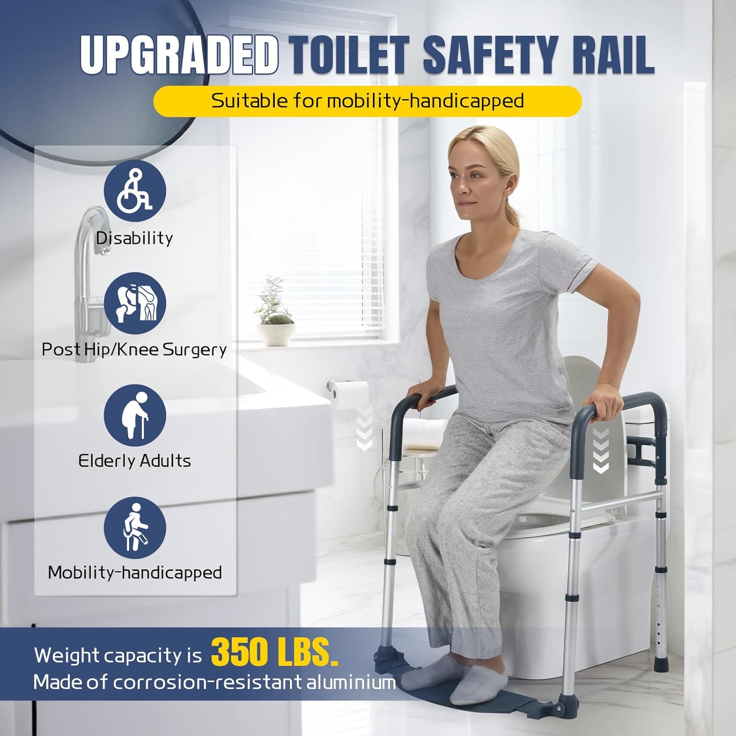 Foldable and Heavy-Duty – Supports up to 350 lbs: Our upgraded toilet grab bar folds flat for compact storage and easy portability. Built from high-strength alum