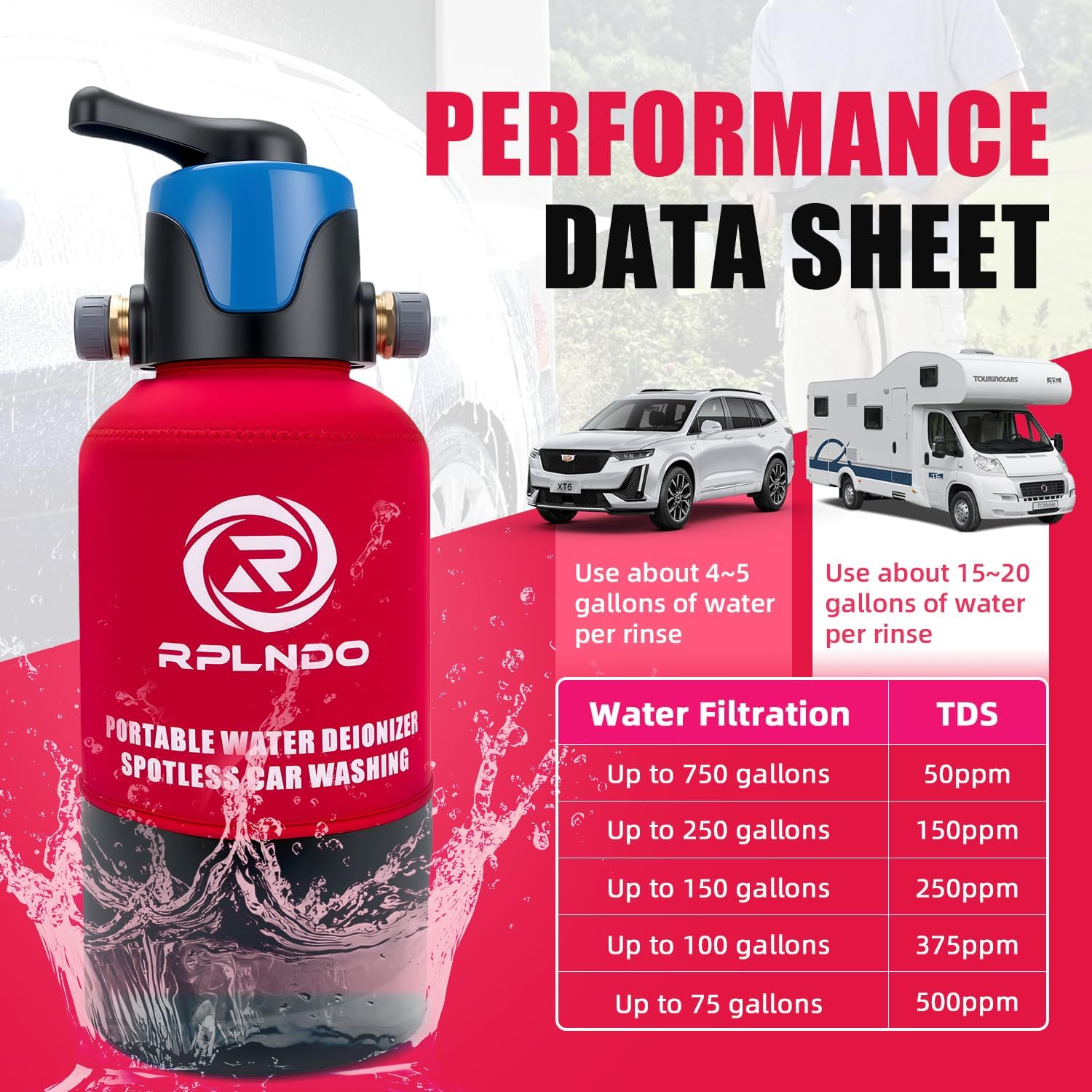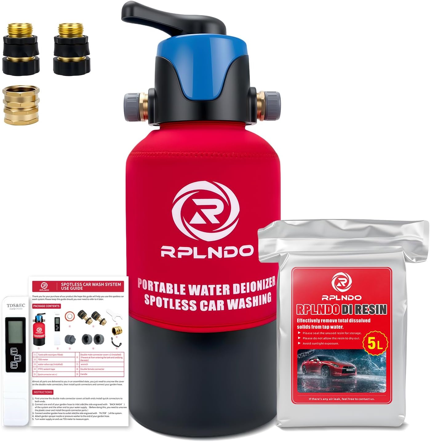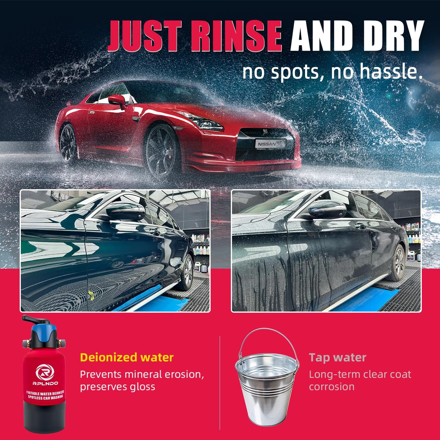 Spot-Free Rinse & Paint Protection: Our deionized water system is equipped with high-quality 5L mixed bed resin that effectively removes TDS (Total Dissolved Solids) from tap water. This helps prevent water spots after air drying, keeping your car’s paint clean, smooth, and looking like new.