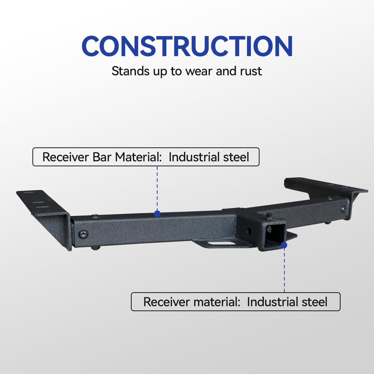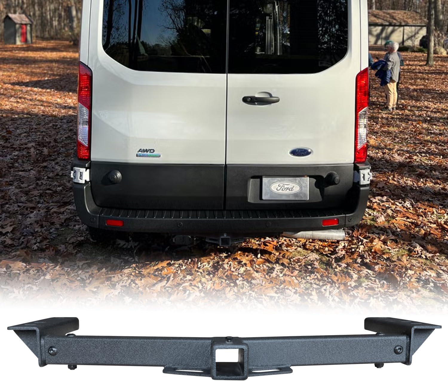 Steel trailer hitch/2” hitch receiver compatible with: select model years of the Ford Transit150,Transit-250,Transit-350 and E-Transit, Not compatible with modified bumper.