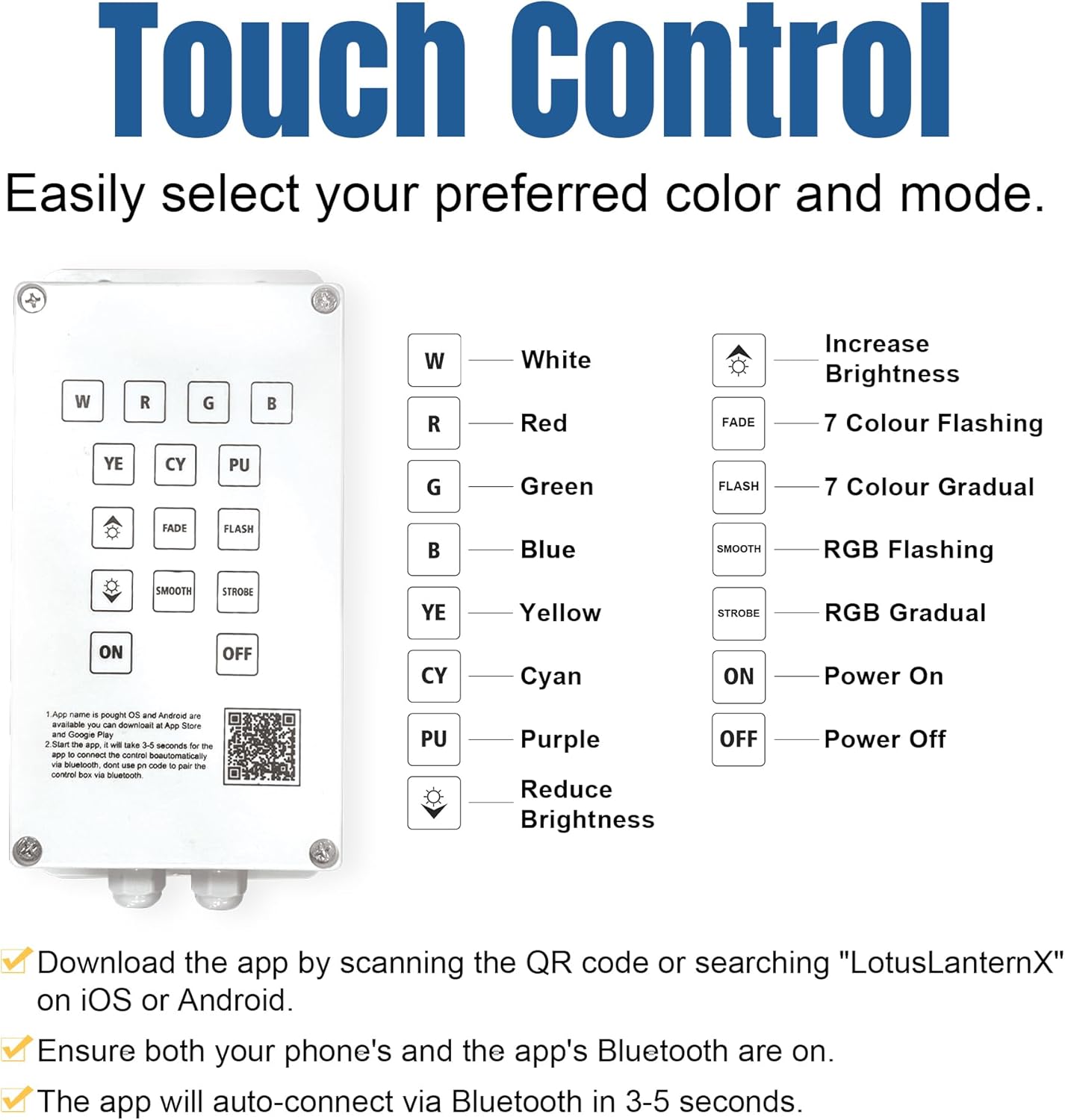 Our pool light provide three seamless control options: a user-friendly app, a convenient remote, and a robust manual controller—backed by an integrated outdoor controller with a dedicated signal receiver to eliminate signal loss in water or metal environments. You can connect up to four lights per controller, which supports only DC12V fixtures; AC12V lights are not compatible