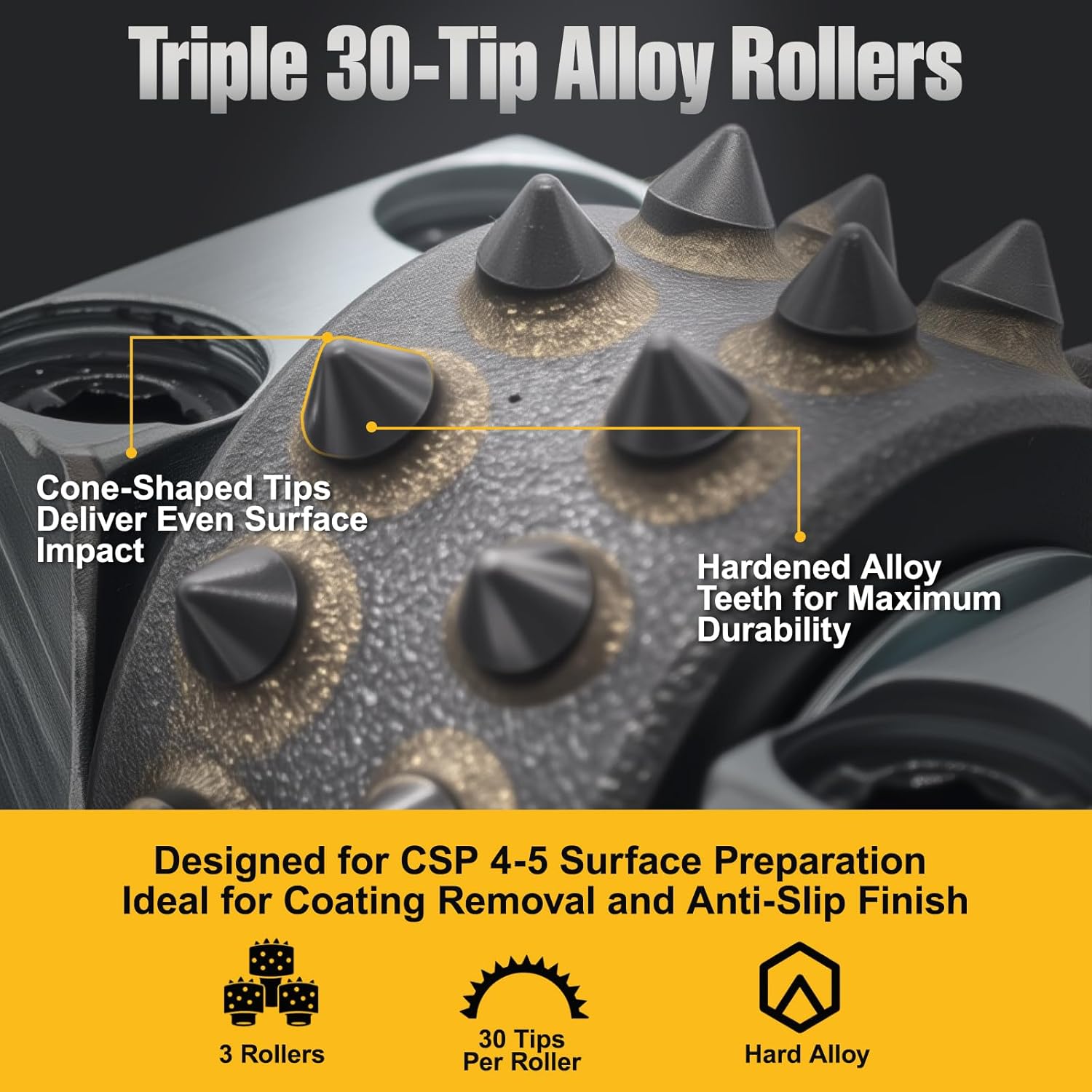 [Heavy-Duty Rollers] Triple 30-tip hardened alloy rollers.Designed for powerful, even grinding impact on stone and concrete