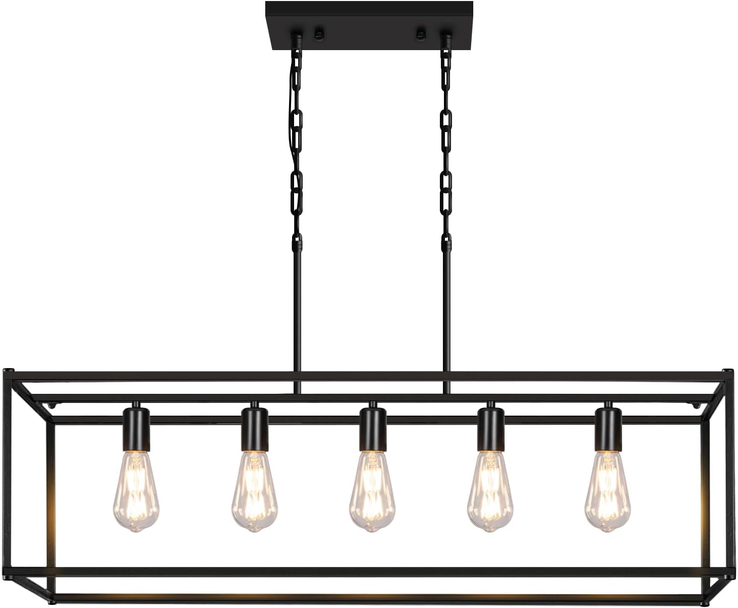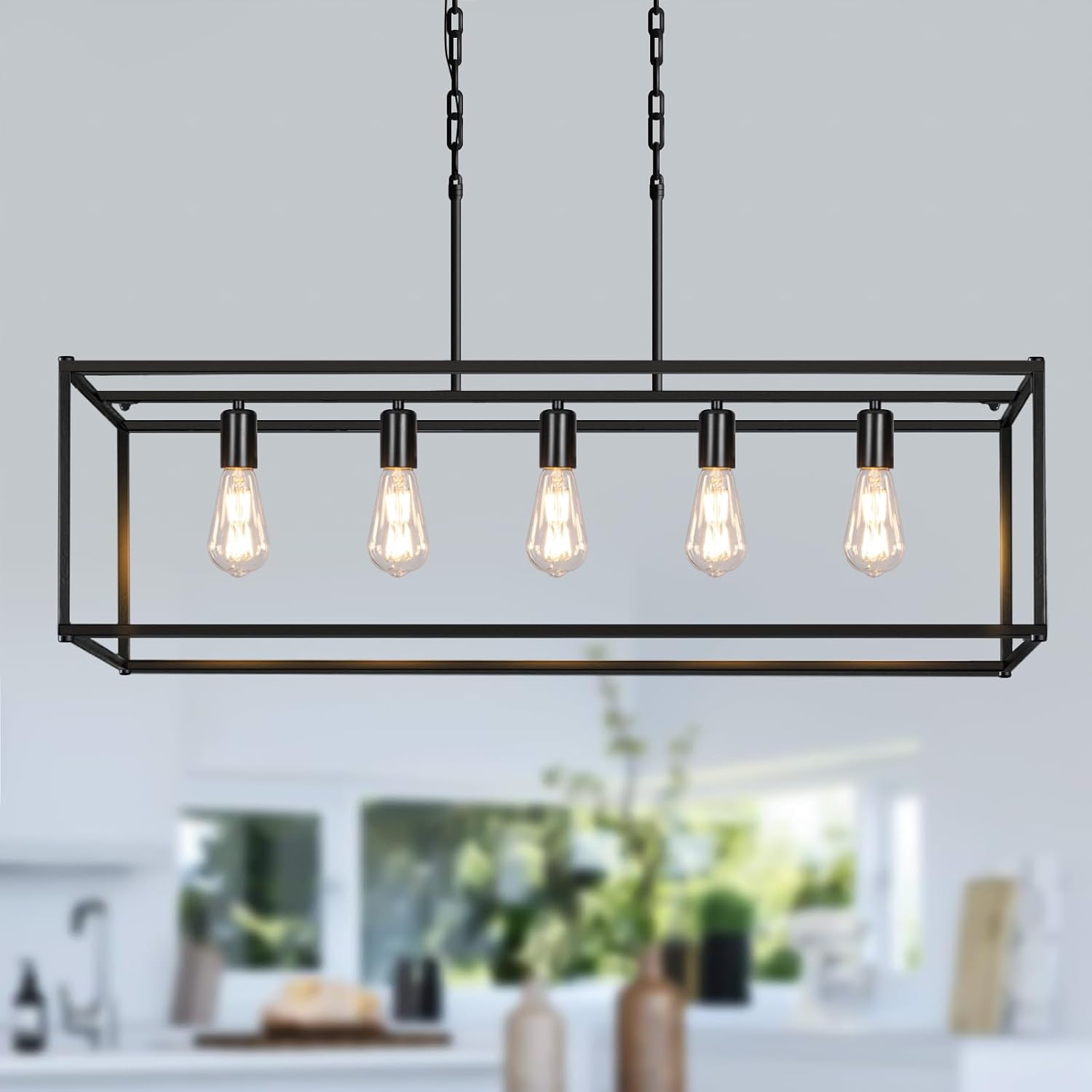 5-Light Rustic Farmhouse Chandelier, Rectangular Metal Kitchen Island Pendant Lighting Fixtures, Black Industrial