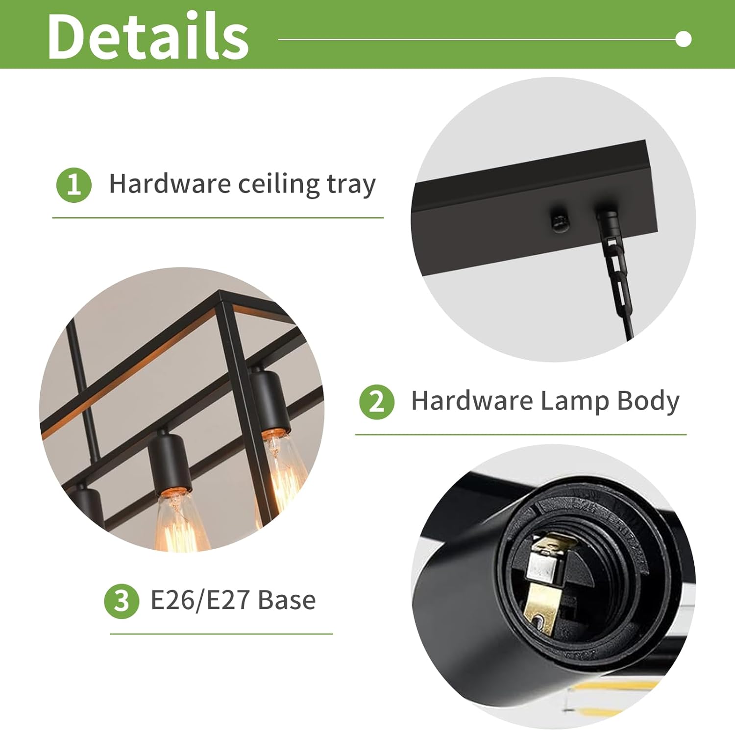 Rustic Farmhouse Chandelier -- This vintage linear pendant light features a rectangular design with a open design, using thick metal welding, high-quality matte black spray painting technology, unique design, and sturdy quality, giving the product a unique and rich rustic industrial style. It is definitely the best choice for your home lighting and decoration.
