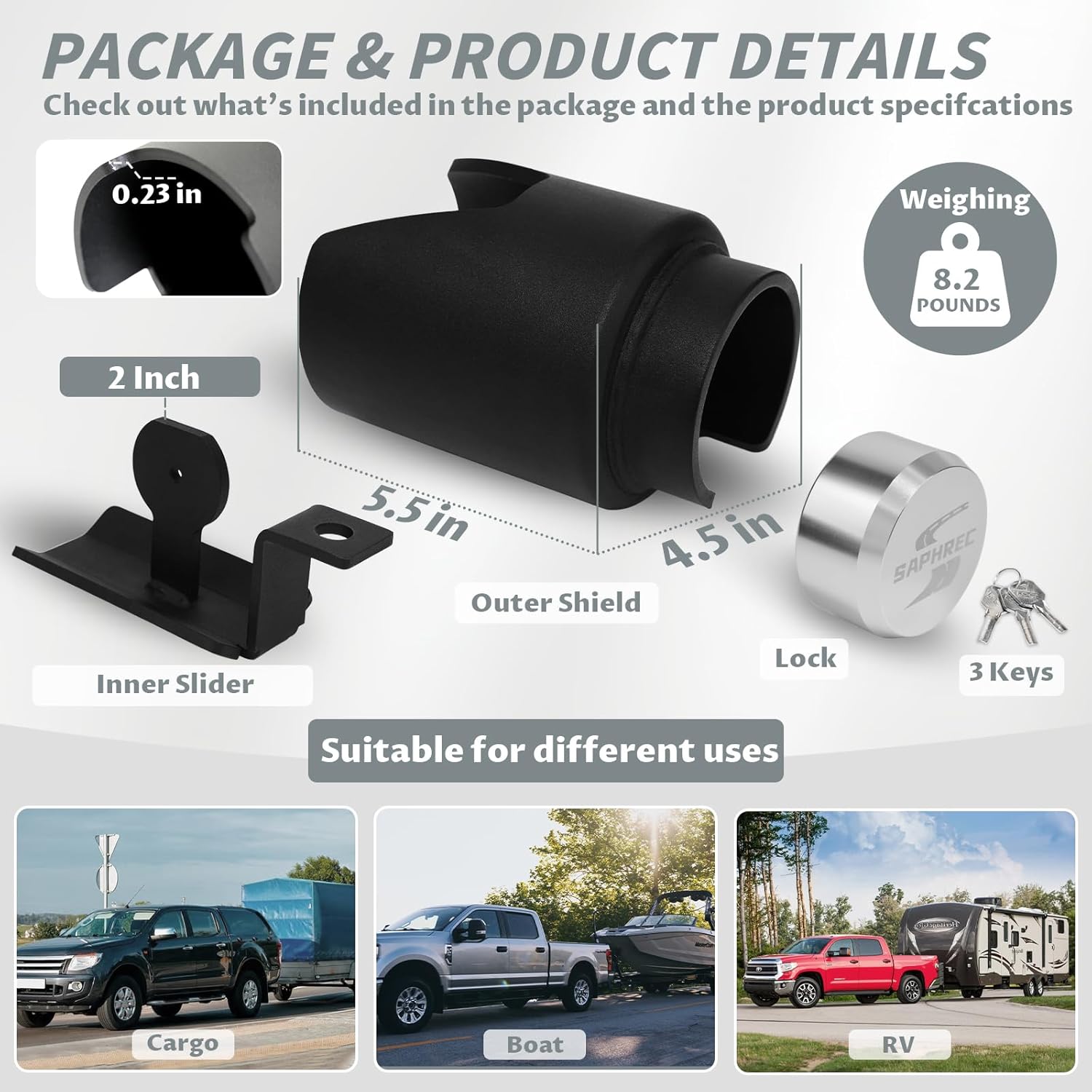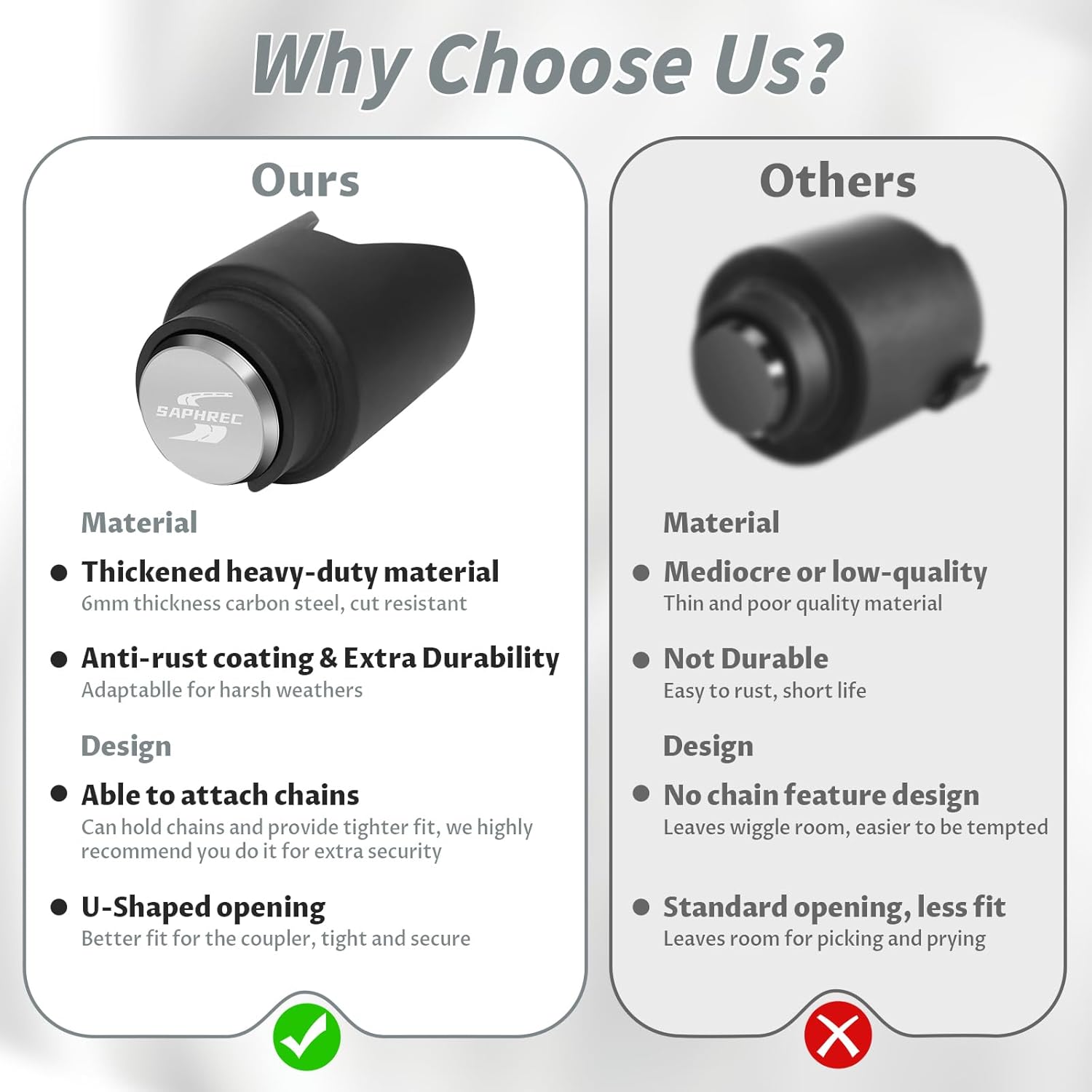 Heavy Duty MaterialThe SaphRec Trailer Lock is constructed from high-strength carbon steel, with a thickness of 0.23 inches, ensuring superior durability and resistance to impact. Weighing 8.2 lbs, this hardened trailer hitch lock offers robust protection against theft. Additionally, it features a high-quality powder coating that provides reliable rust-resistance, making it suitable for all weather conditions.