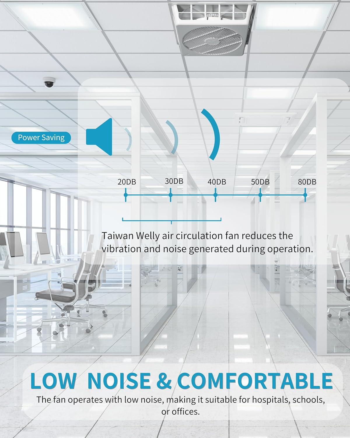 Space Saving for Office Drop Ceilings: This low-profile ceiling fan is specifically designed for drop ceilings, featuring an overall height of 7 inches and a visible thickness of just 5 inches after partial recessing. It seamlessly integrates into offices, maximizing space while providing efficient cooling. Ideal for clinics, classrooms, offices, and other compact indoor spaces
