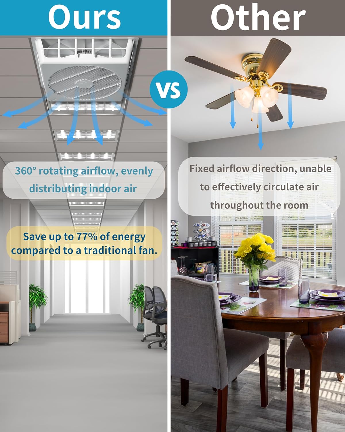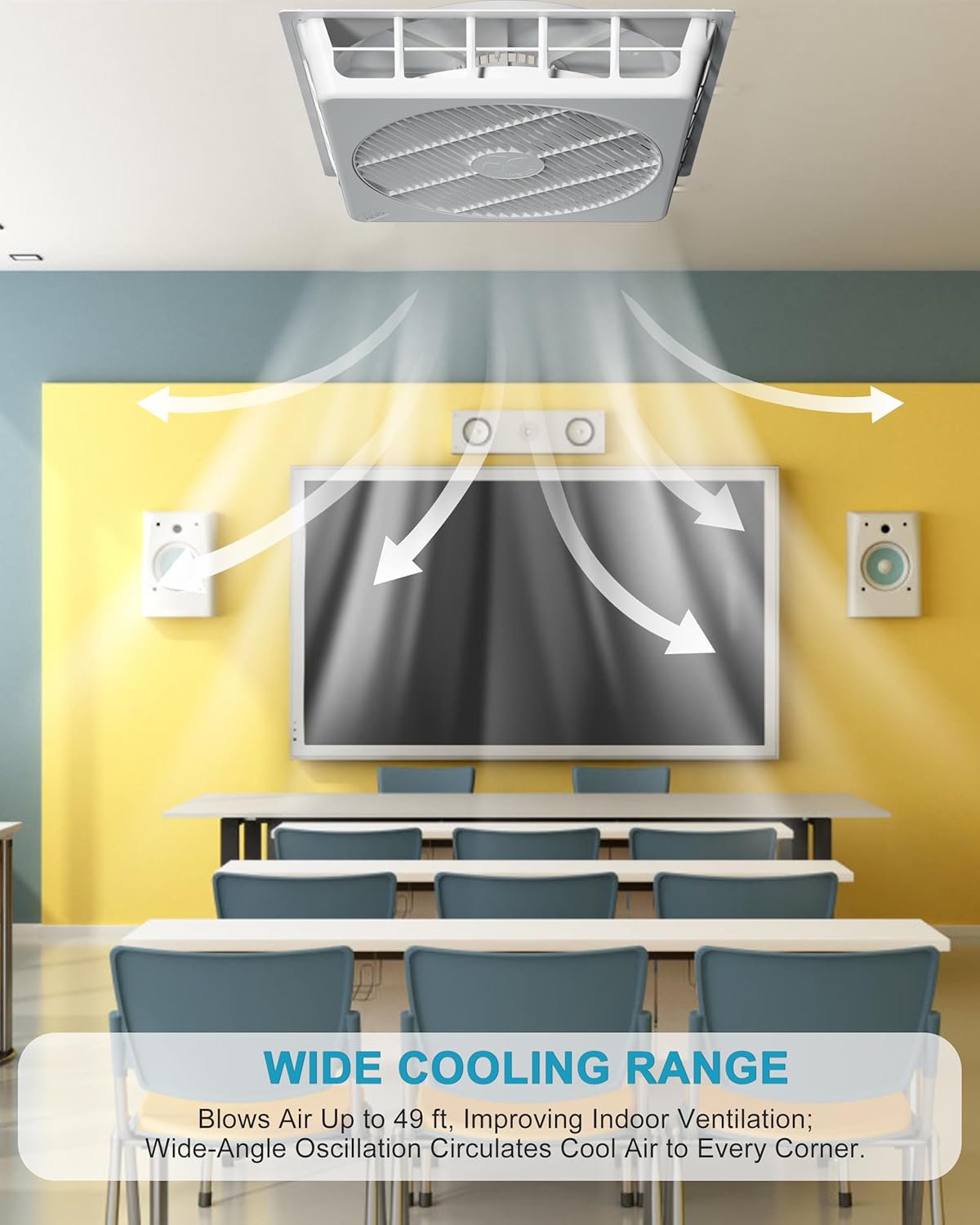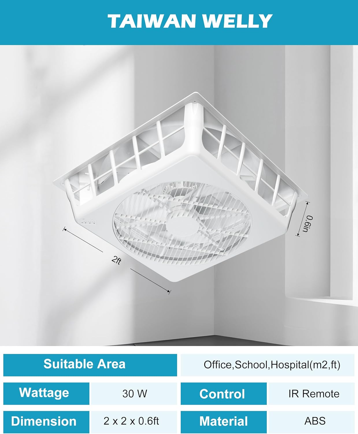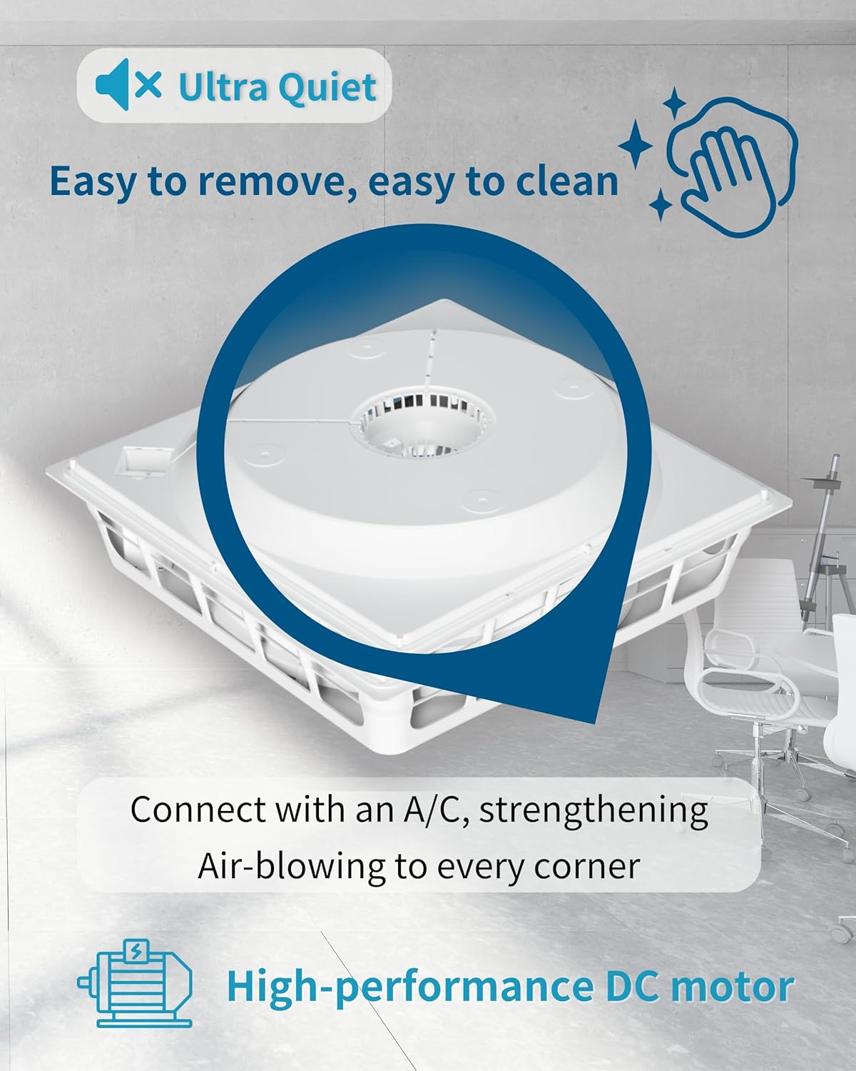 Easy Installation: Designed specifically for drop ceilings, this fan effortlessly integrates into T-bar ceiling grids for a secure and flush fit. With the included step-by-step instruction manual and remote control, it`s quick and easy for one person to install in just minutes