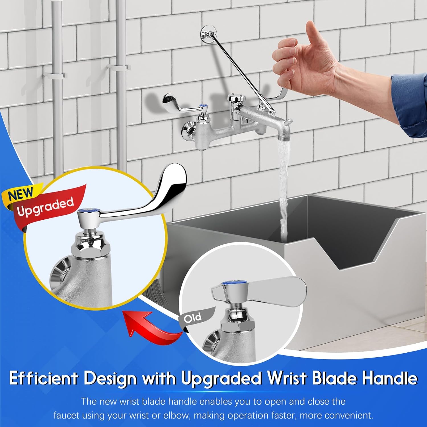 Effortless Operation with Upgraded Wrist Blade Handle: Featuring the upgraded wrist blade handle, which enables you to open and close the faucet using your wrist or elbow—eliminating the need to touch with your hands—making operation faster and more convenient. Perfect for busy restaurant kitchens, school cafeterias, bars, maintenance environments, laundry, or food service settings. Its smooth, effortless turn enhances safety during frequent use, making cleaning and maintenance quicker
