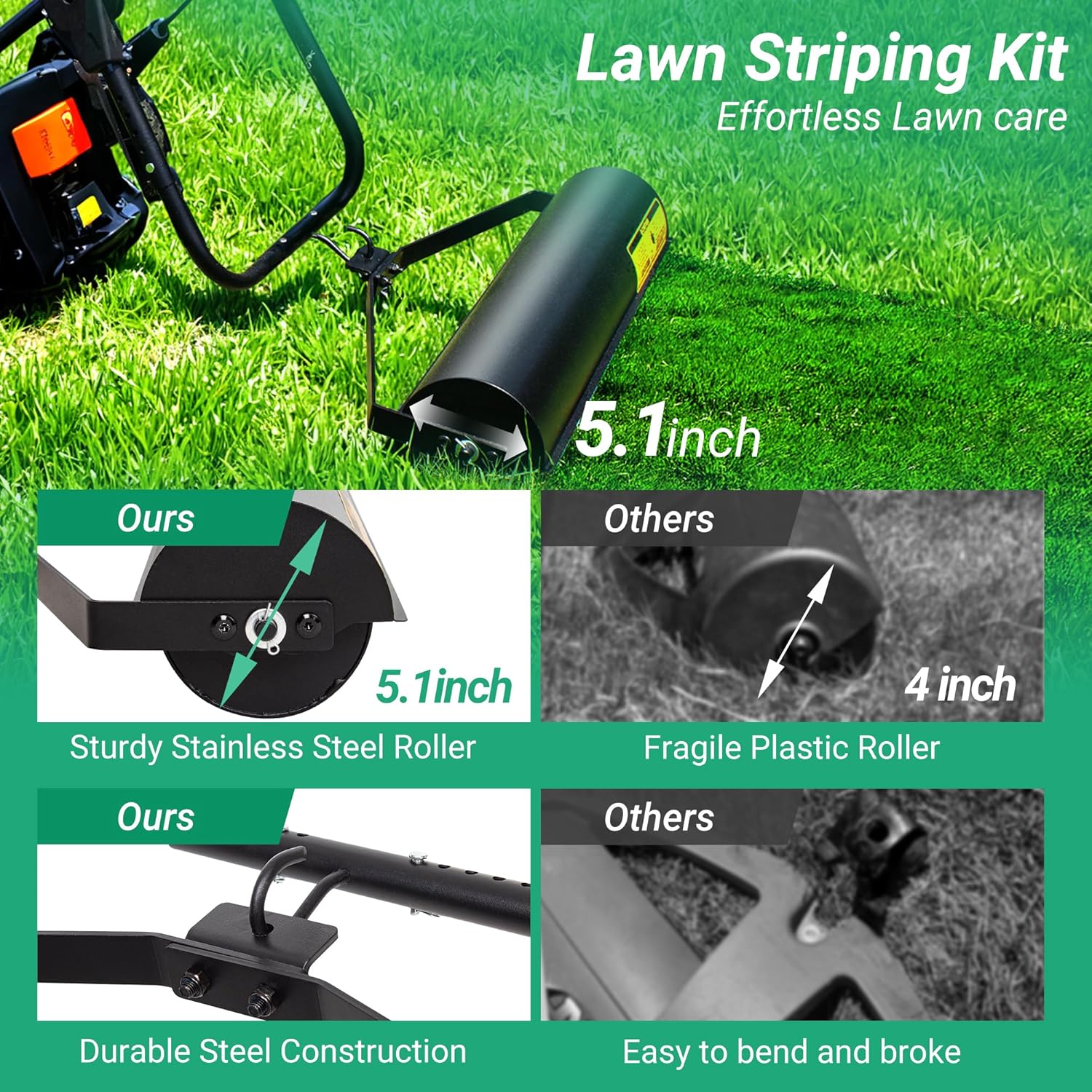 Durable All-Metal Material: Our lawn striper is made from heavy-duty steel that resists rust, dents, and cracks. It features a premium 5.1-inch diameter stainless steel roller for deeper stripes. Unlike flimsy plastic rollers that easily wear out or break, this sturdy metal design handles rough terrain and frequent use season after season. The roller also includes a flexible silicone plug that seals tightly to prevent leaks and easy to take down. Made to perform and built to last.