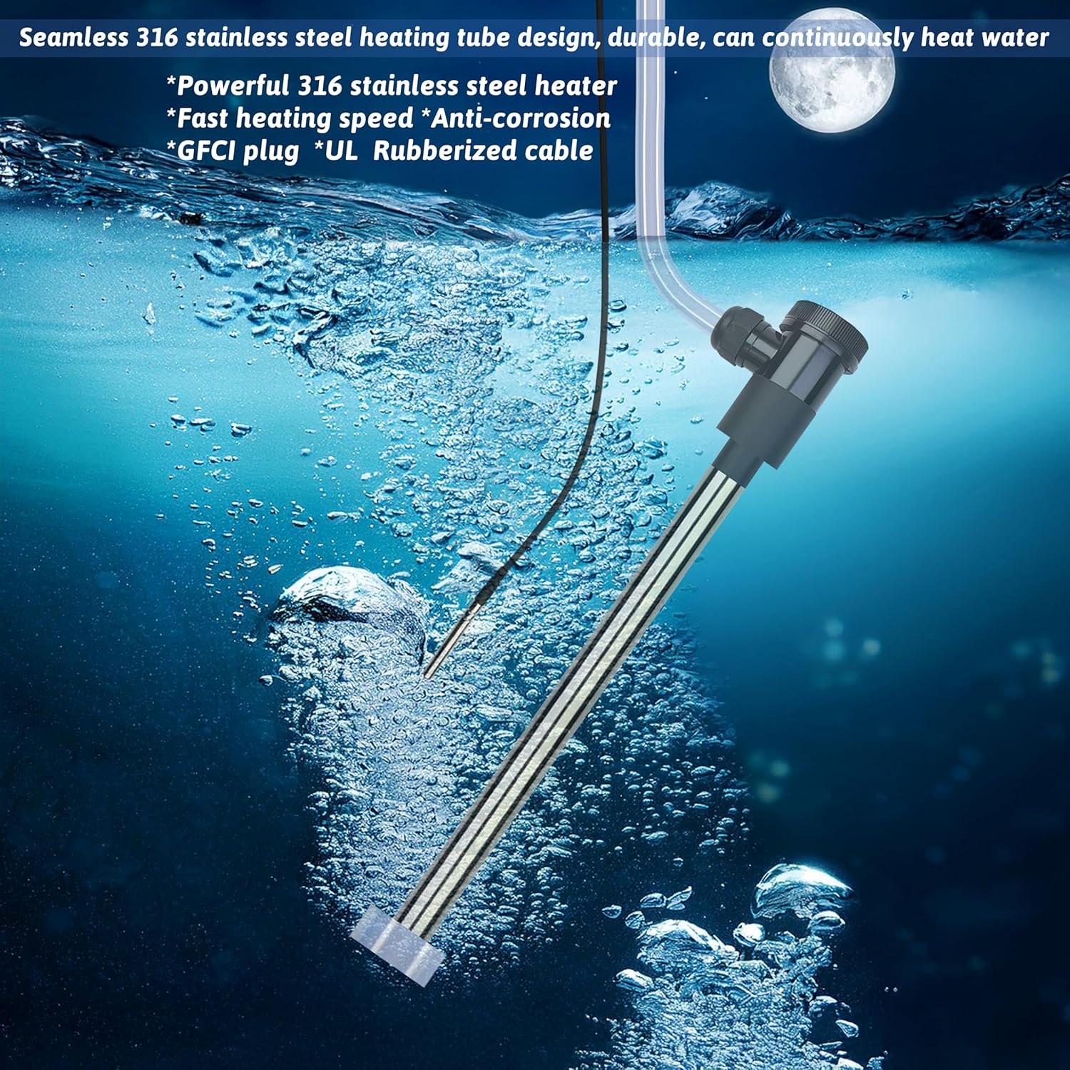 Fast Heating, Safe Design & Easy Cleaning: This submersible immersion heater combines rapid performance with thoughtful safety features. Made of 316 stainless steel, it heats water quickly and evenly—reaching optimal temperature in just 1 second while reducing preheating time. The fully waterproof design, paired with a silicone-wrapped power cable, provides reliable insulation against water exposure and electrical hazards. Its smooth stainless steel surface resists scale buildup for easy cleaning and long-term stable heating. For added protection, the bottom of the heater rod includes a silicone gasket that helps prevent overheating damage to soft-sided containers like inflatable pools.