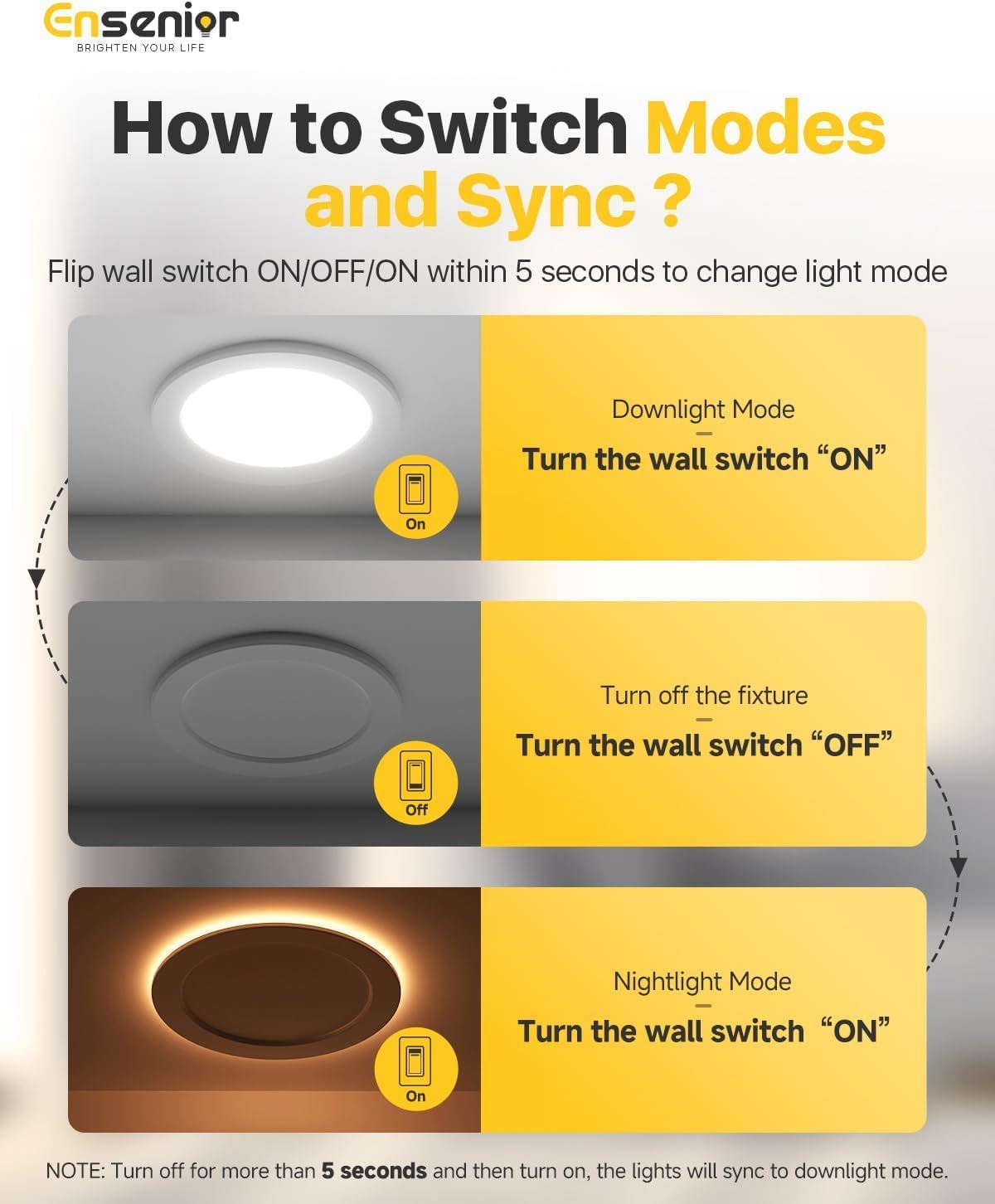 Synchronization Reset FunctionEvery time when you turn on the light, it will automatic reset to downlight mode. If the lights are in different modes, you could turn the wall switch off for over 5 seconds and turn on again to synchronize the lights to downlight mode, or turn it off and on in 5 seconds to Night light mode.