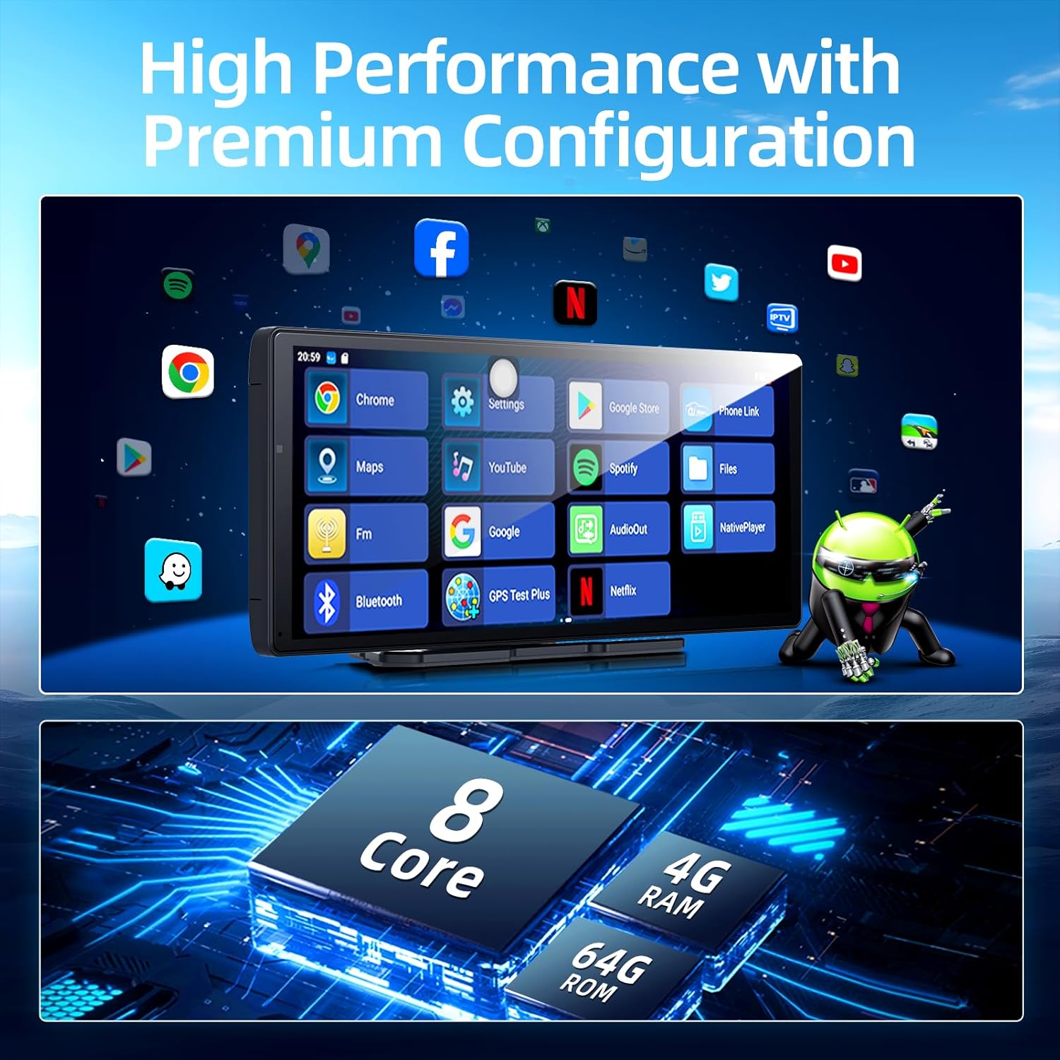 HIGHLY CONFIGURED PERFORMANCE:8-Core CPU + 4GB RAM + 64GB ROM Additional storage capacity Experience driving in a different way: With the latest Android system, you can install the latest apps on this product whenever you have a Wi-Fi connection. Enjoy YouTube, Netflix and Prime Video videos on the 11.3-inch in-car display. Enjoy a different driving experience with the fast performance of the 8-core CPU and the large capacity of 4 GB RAM + 64 GB ROM.