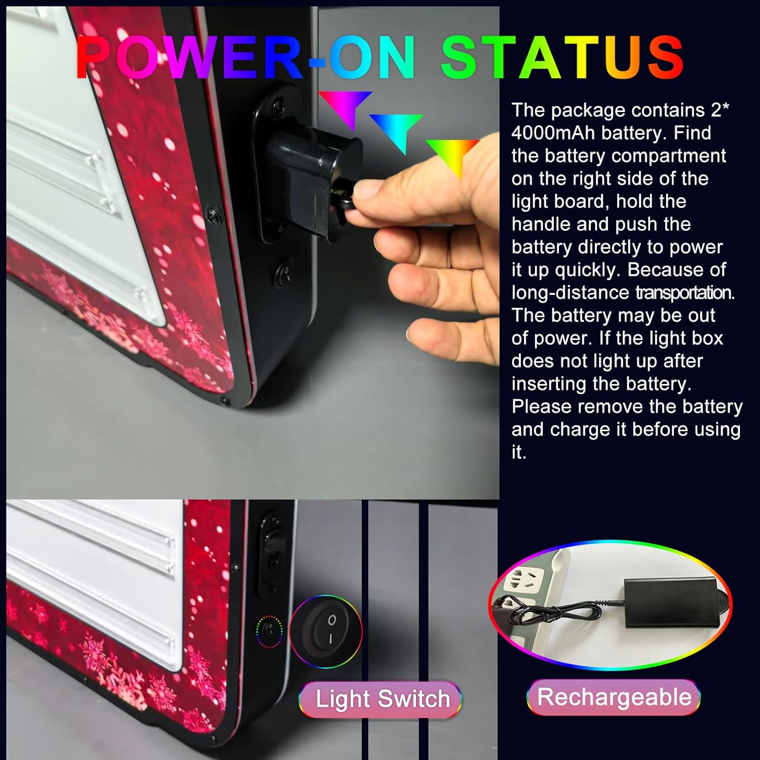 LIGHT SIGN IS VERY CONVENIENT TO USE- The color changing light box uses a 4000mAh*2 rechargeable battery (removable). It can be used for about 3-4 hours after charging for 6 hours. Slide the letter cards into the light box slots and quickly decorate your New Year`s Party, Light shows, Christmas tree, family gatherings, flower car parades, sweater parties, or cookie parties.