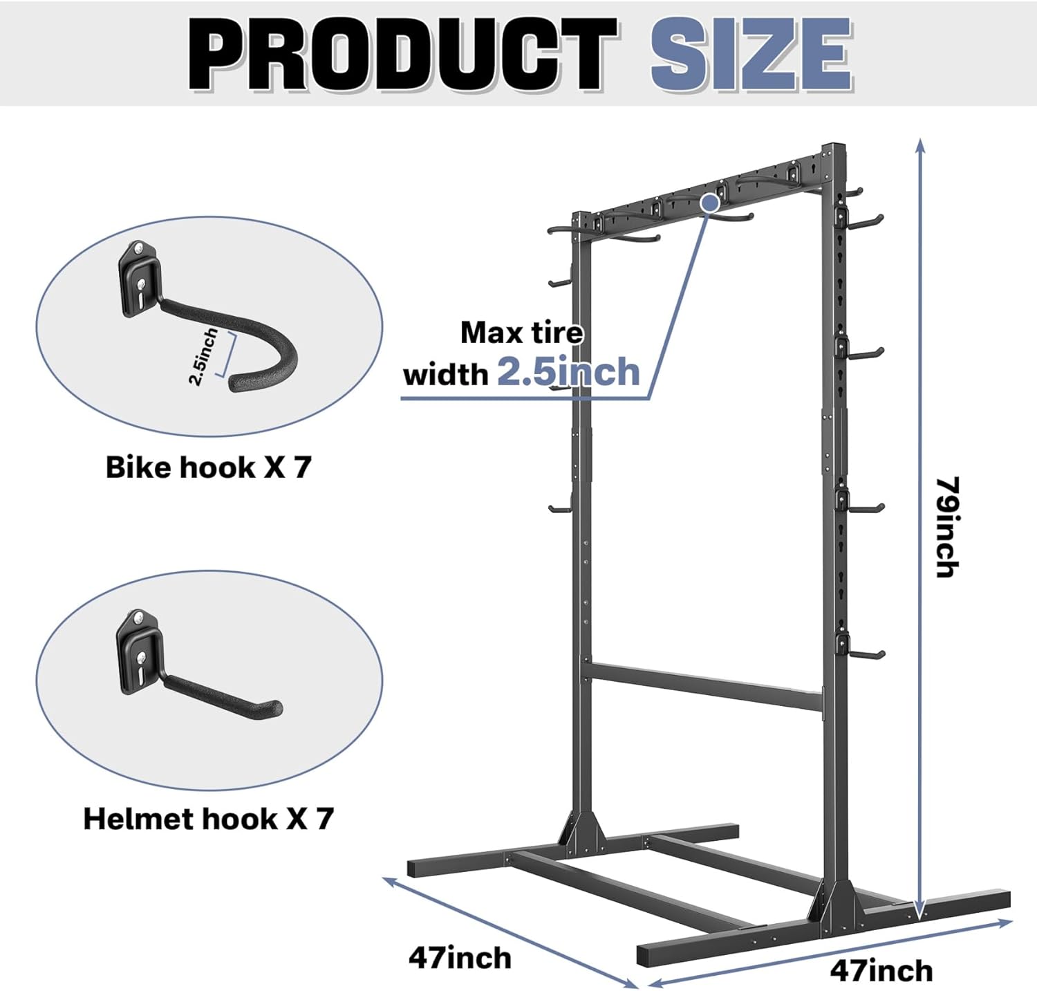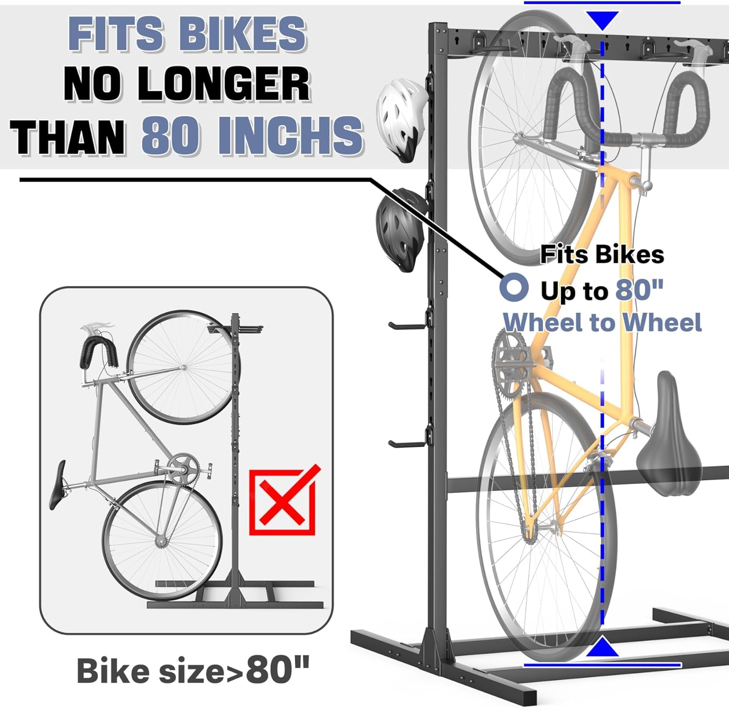 7 Adjustable Bike Hooks: Features 7 adjustable hooks on the horizontal bar, 7 helmet hooks on the vertical bar, offering reliable, slip-resistant bike storage to keep your bikes organized and off the floor