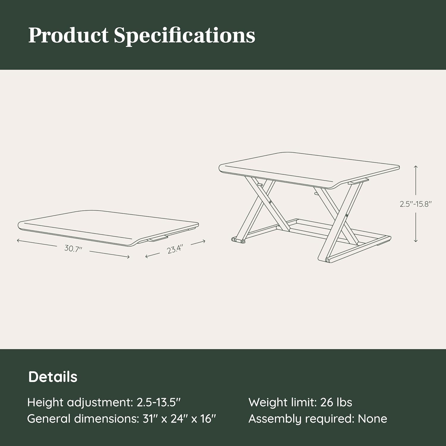 DESIGNED FOR INSTANT SETUP: Get to work in seconds with no tools or complicated instructions. The stand up desk riser arrives fully assembled, so you can enjoy ergonomic movement right out of the box.