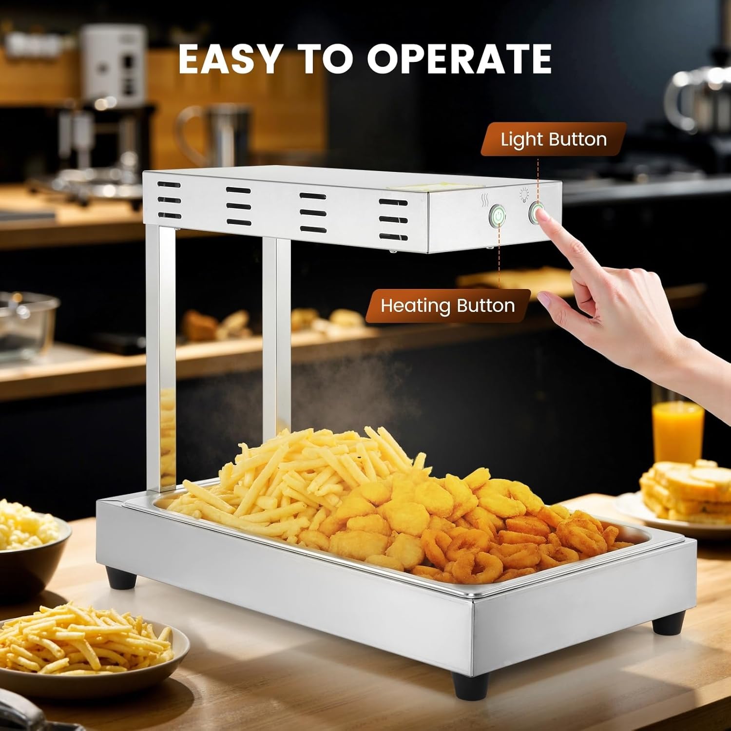 EASY OPERATION: Our french fried food warmer lamp features independent buttons that allow you easily to control it with a button to power the light and another button to power the warmer. Not only keeps the fried foods warm, but also makes them look golden, crispy, and irresistible