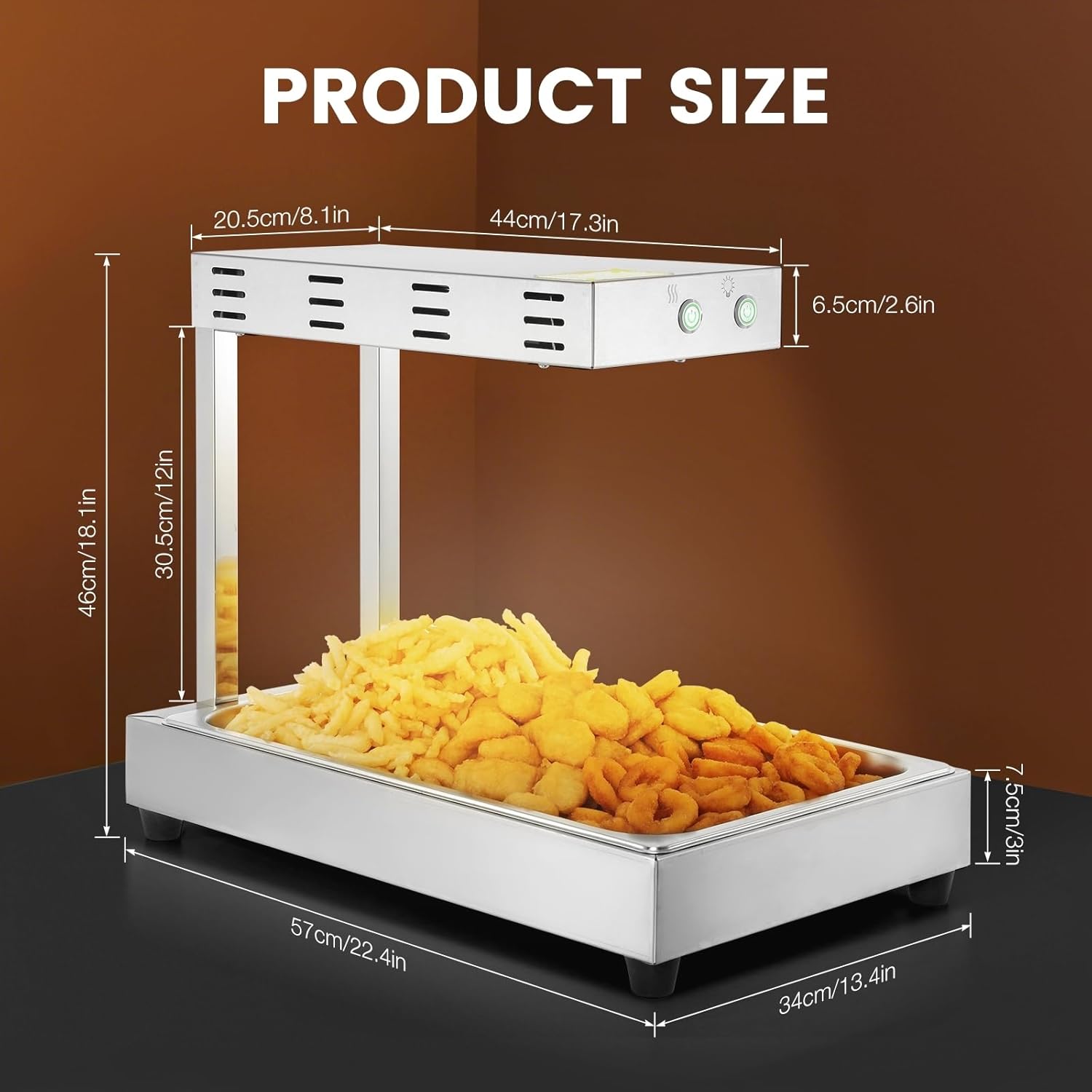 LARGE CAPACITY TRAY: The french fry warmer commercial is constructed from long-lasting 304 stainless steel with a spacious tray (12.2\' x 20.0\' x 2.5\') to hold ample quantities of food. Ideal for various kitchen environments, family gatherings, food trucks, and other food service venues. ideal for home kitchens, parties, or food service settings