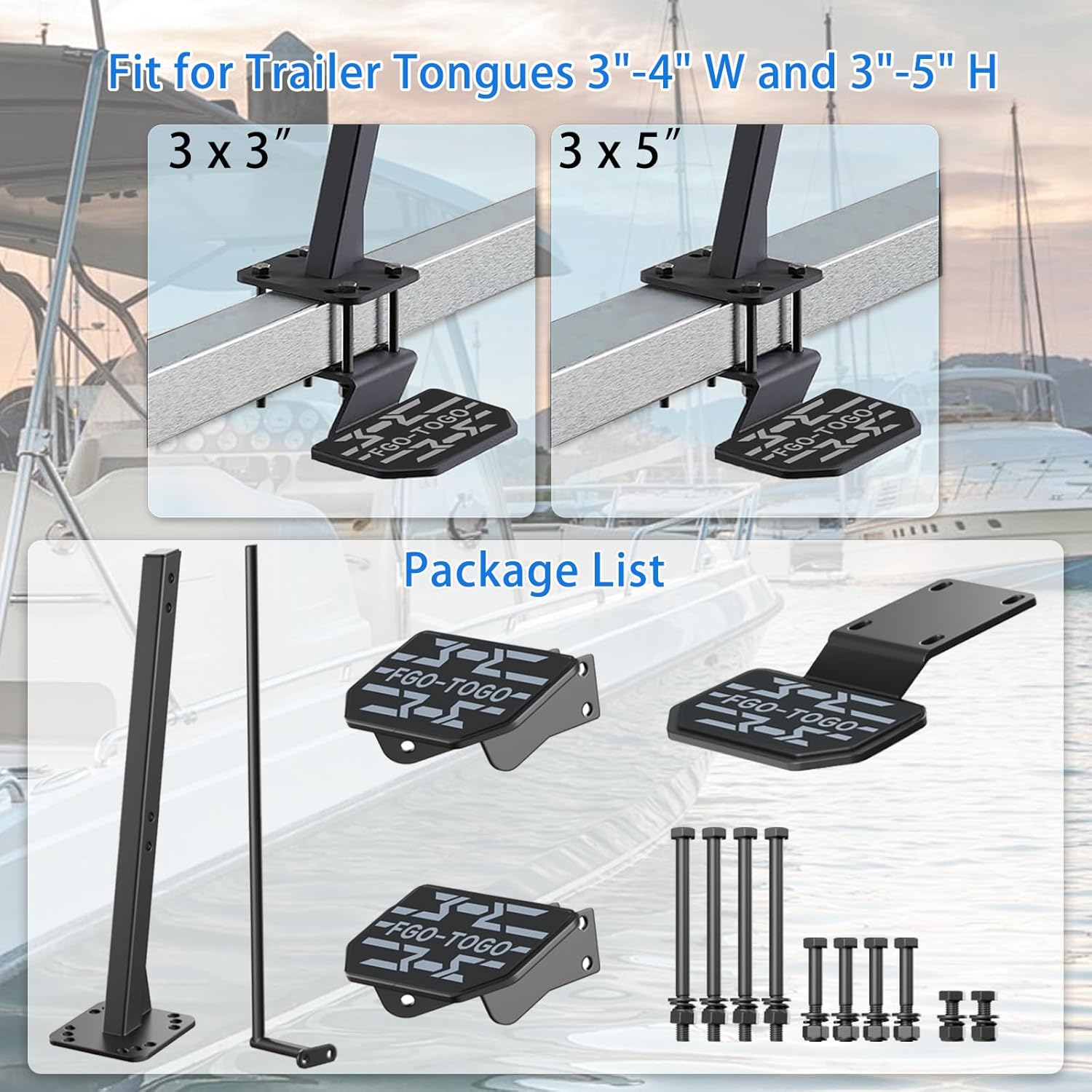 3 Mounting Options: The base of trailer tongue step designed 3 mounting holes to offer 3 adjustable mounting angles,enhanced flexibility with mounting options and the convenience of use.Suitable for most boat trailers and models,fits deep v trailer tongues 3\' to 4\' wide, up to 5\' high