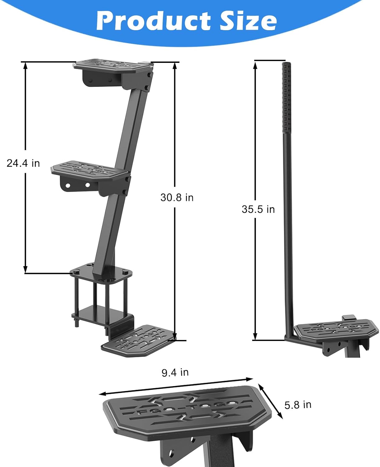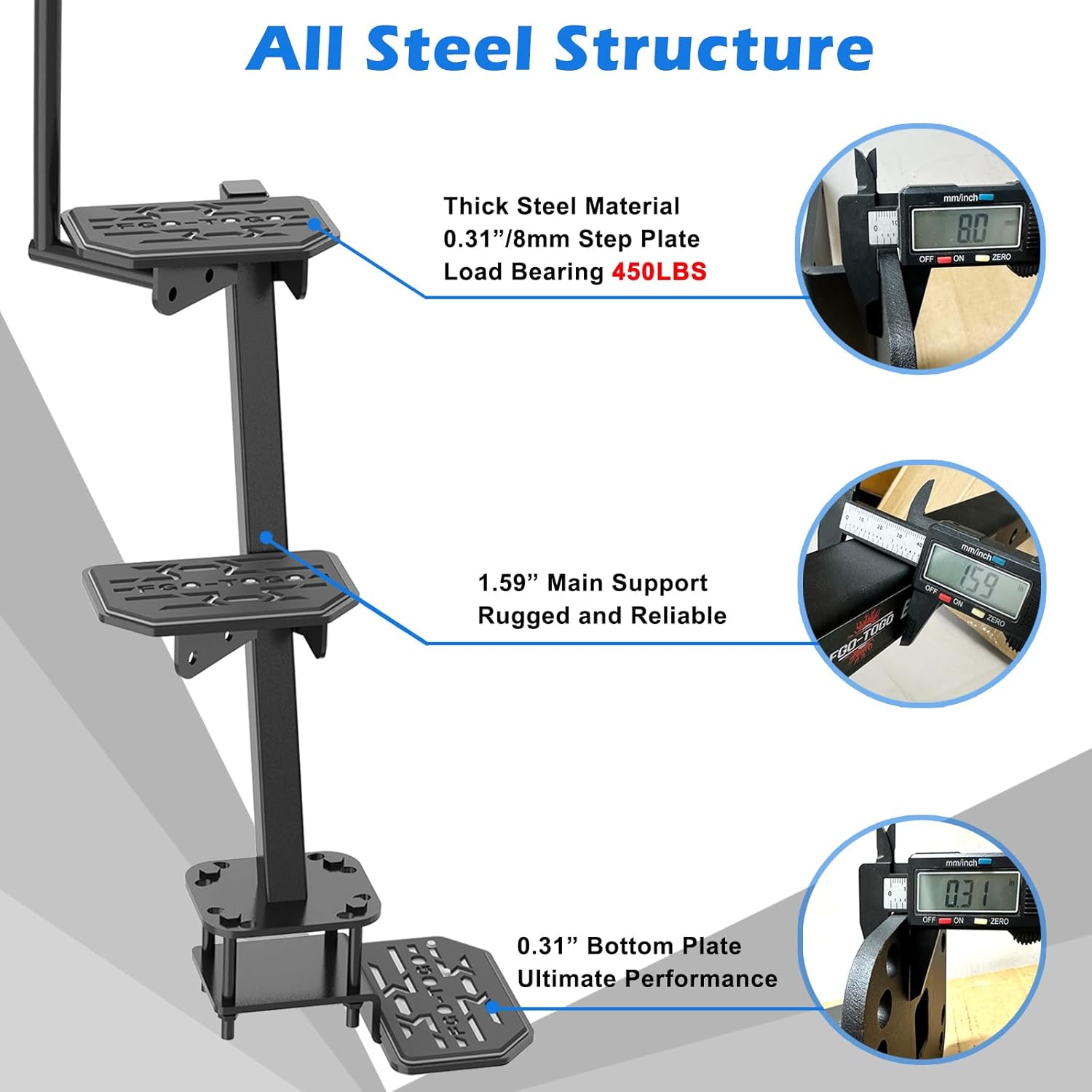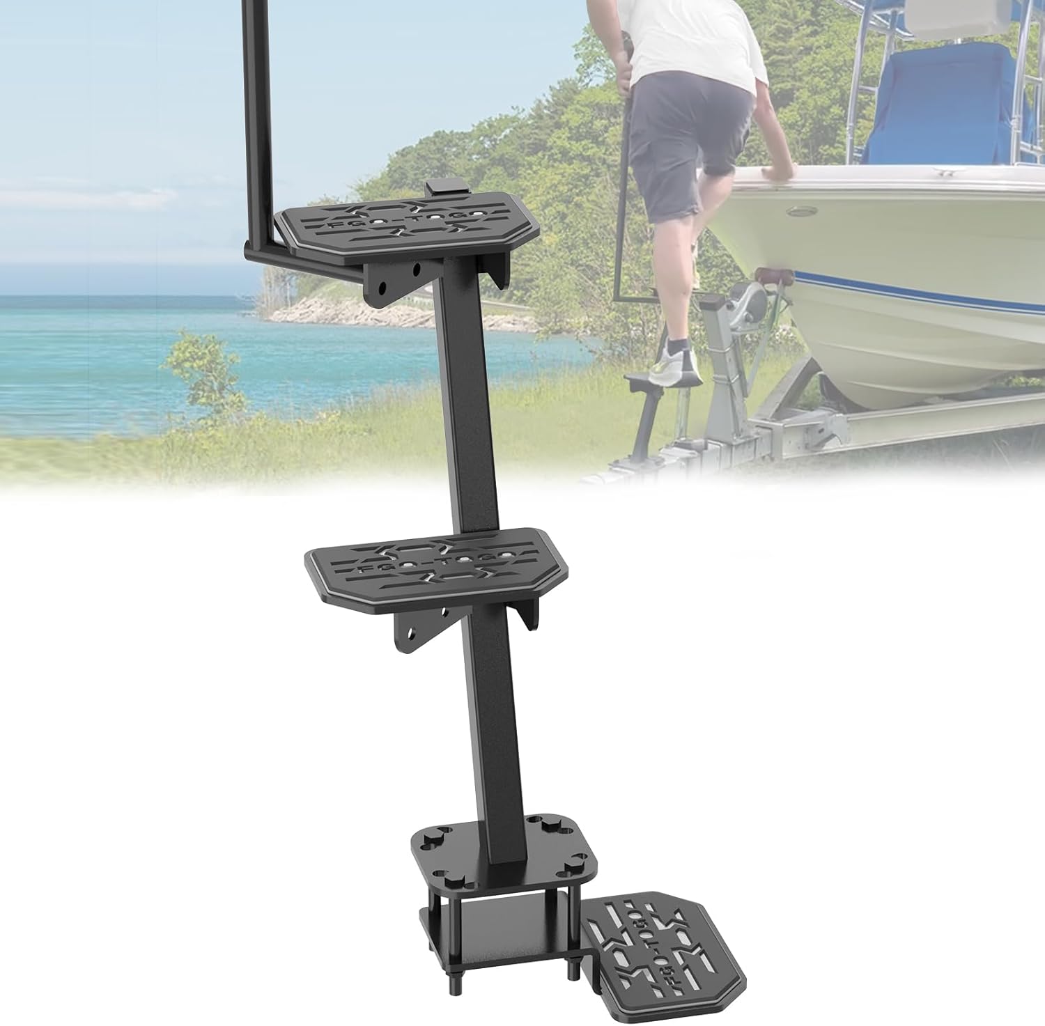 Heavy Duty Boat Steps: Steps weight: 34.8LB,ensure safe,large load-bearing capacity and rugged,the boat trailer steps made of thick 8mm hardend carbon steel,all-steel triangular support structure,holds up to 450 lbs,guarantee stable and durability for years,boarding safety;With a black powder-coated finish,protects it from rust and corrosion,ensuring long-lasting,enhanced weather resistance