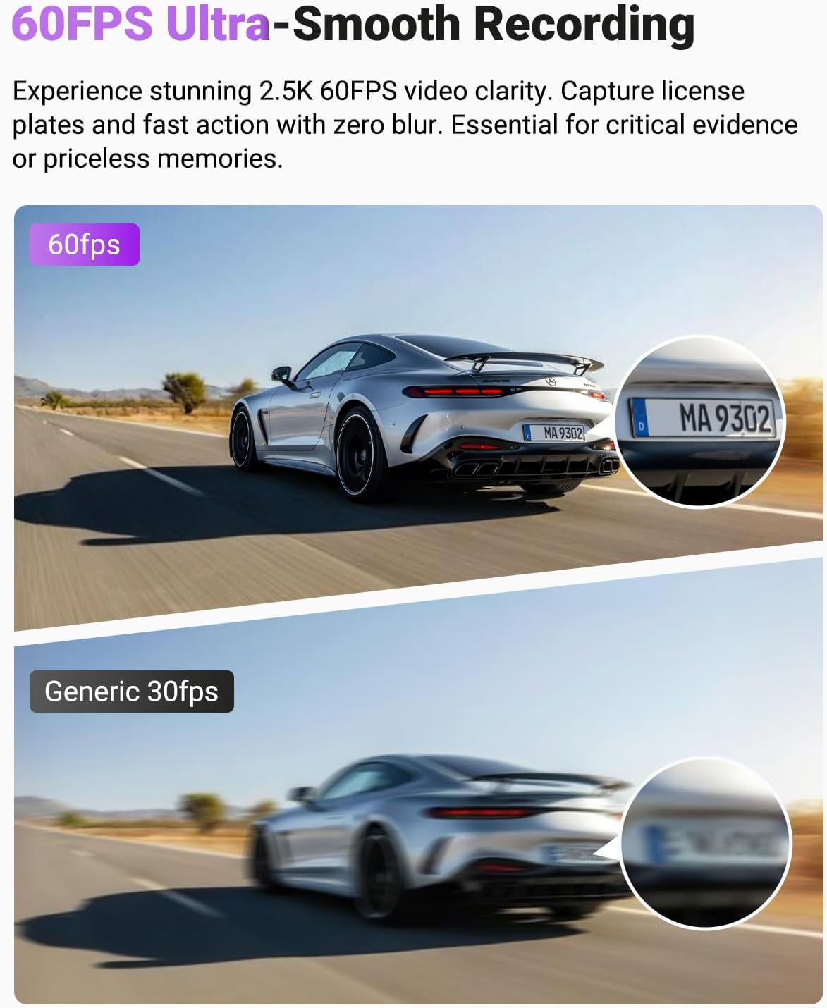 [Crystal-Clear 2.7K Recording] Featuring the STARVIS 2 and F1.8 aperture, Vantrue S1 Pro dash cam records crystal-clear 2.5K@60FPS — double the frame rate of standard 30FPS dash cams to eliminate motion blur during high-speed driving or sudden braking, delivering the critical details like license plates and road signs.