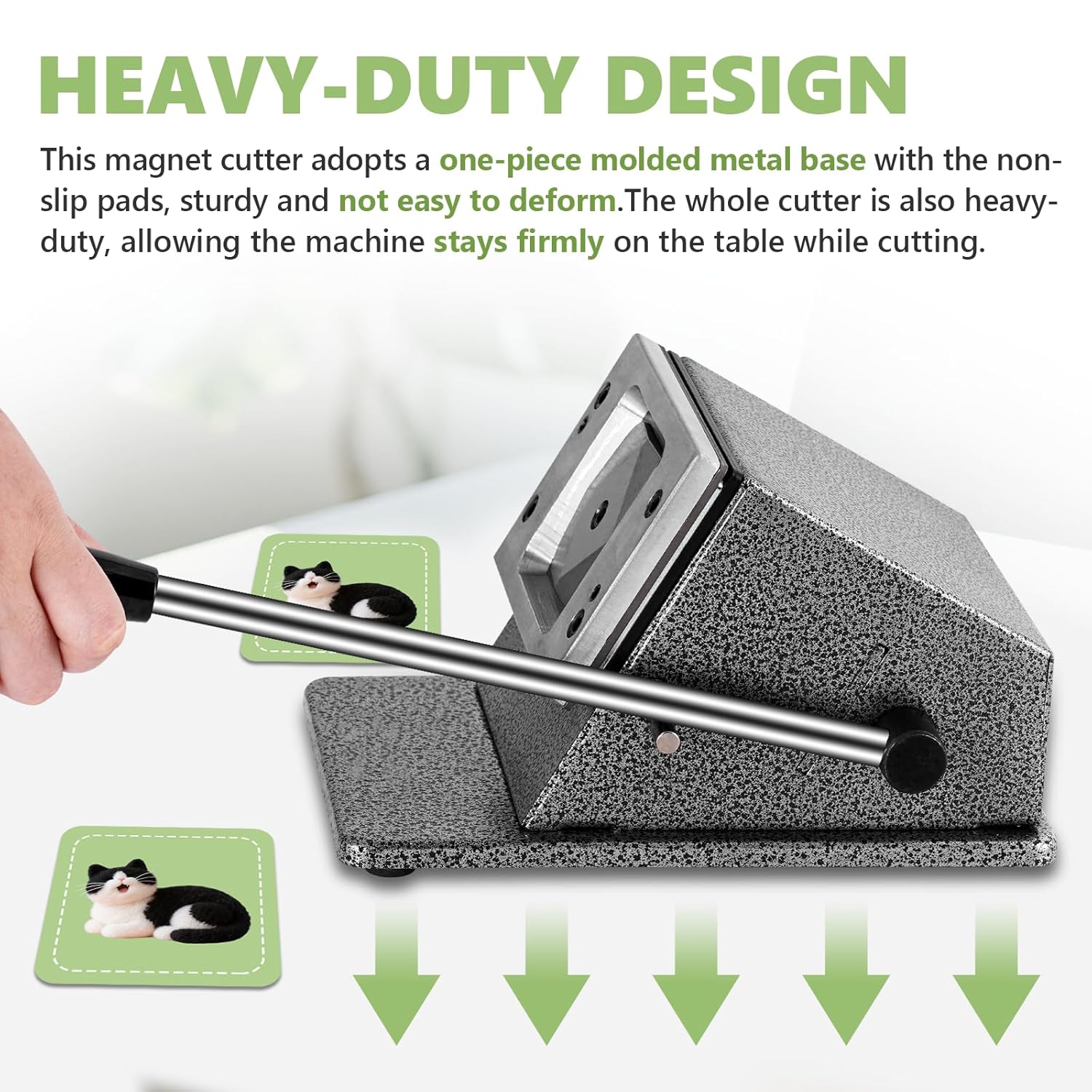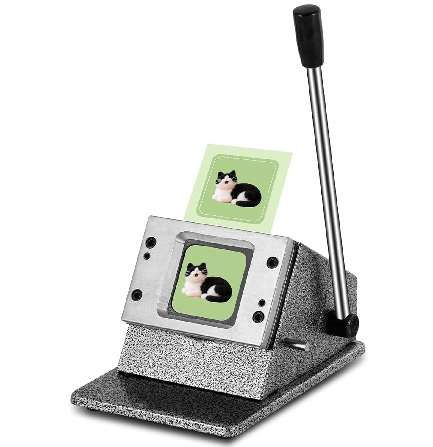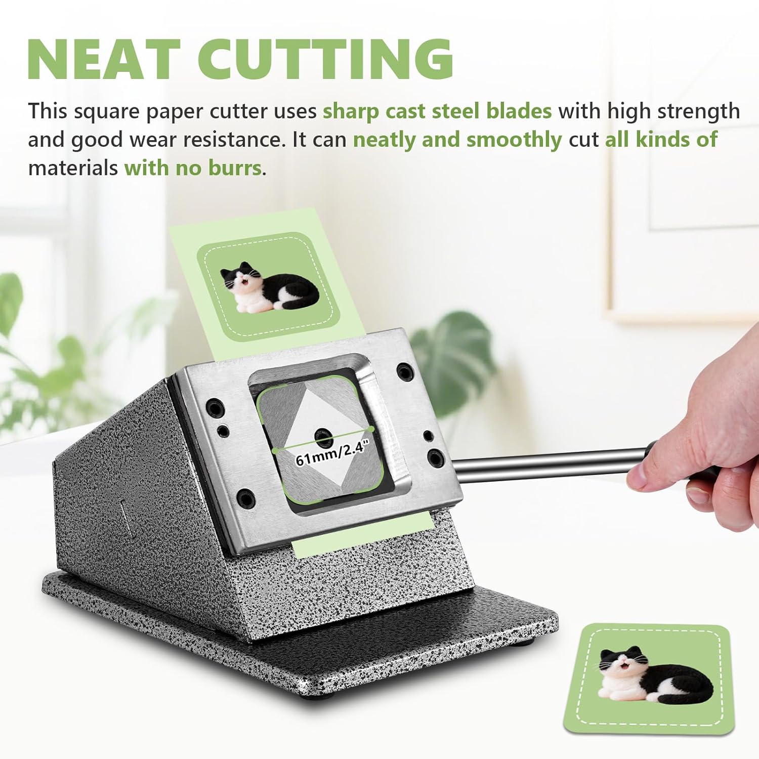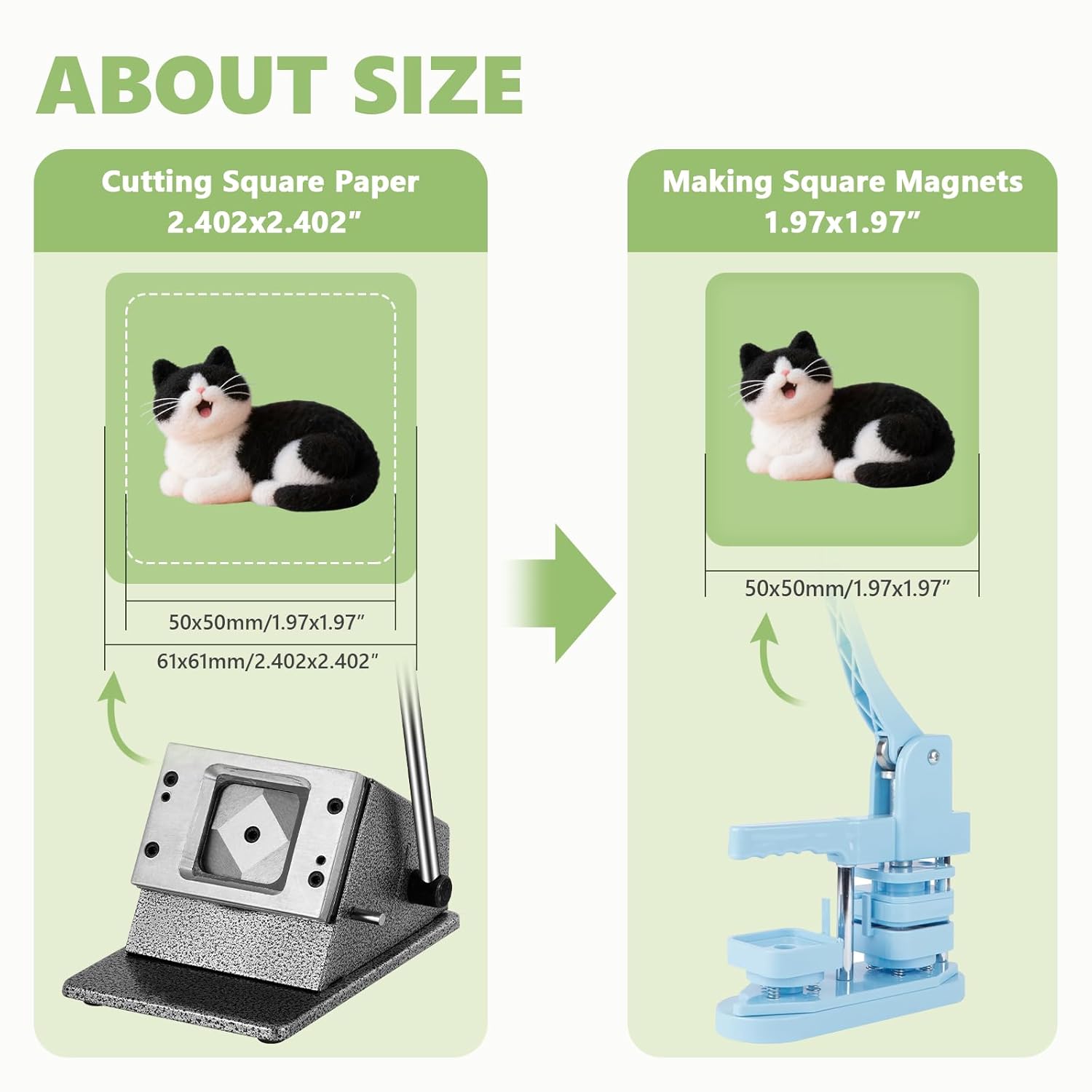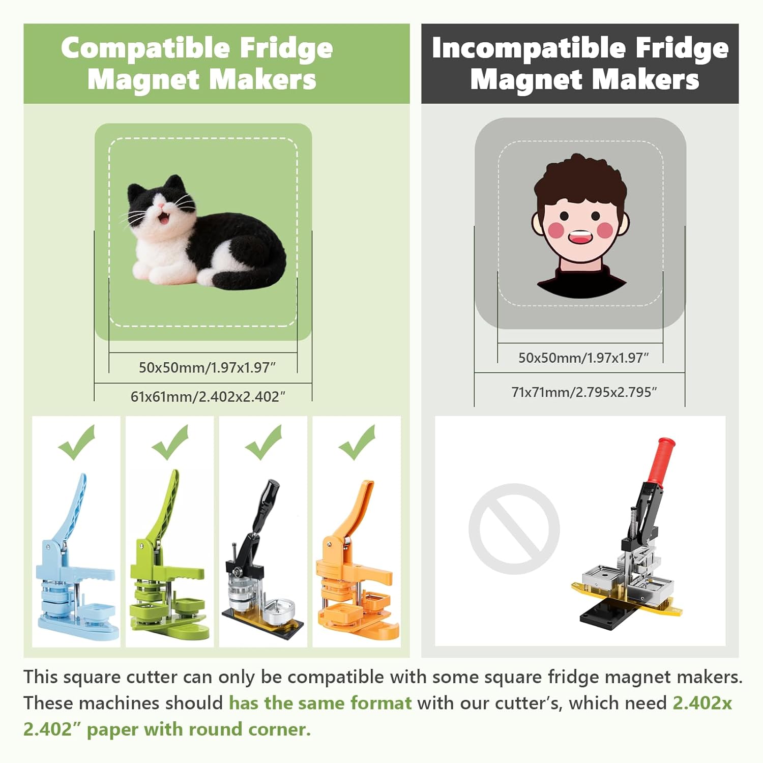 Versatile Usages This square punch cutter can cut a variety of materials into a 61x61mm square with rounded corners, compatible with 2x2” magnets makers on Amazon. It can cut paper <300g, including photo paper, coated paper, A4 paper, stickers, cardboard, etc.. You can use it to make fridge magnets, badges, artwork, souvenirs, etc.