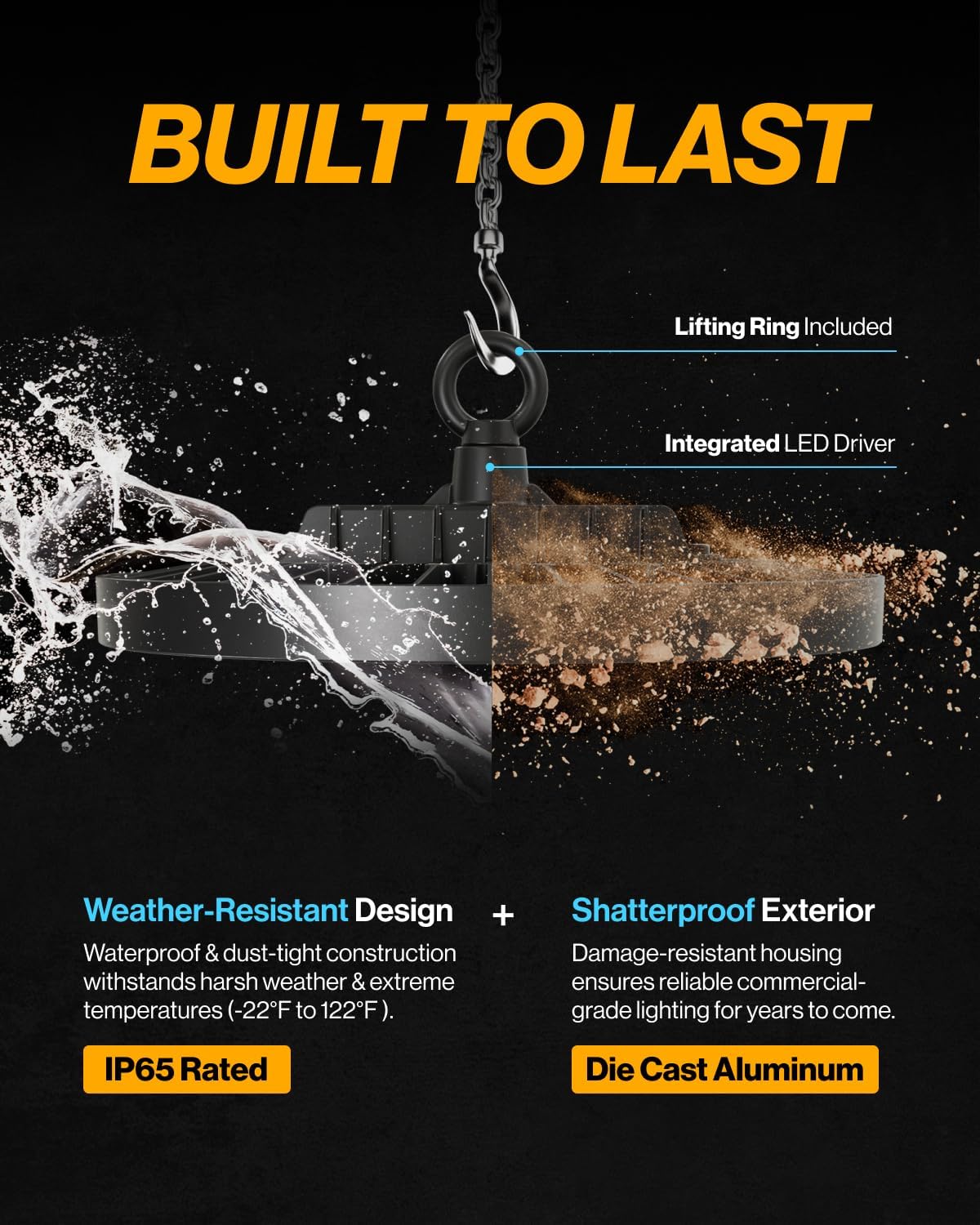 COMMERCIAL-GRADE - With its shatter-resistant aluminum housing, our UFO High Bays replace outdated HID fixtures with resilient & durable illumination. IP65 waterproof rating ensures reliable, bright light in any weather. UL & DLC certified.