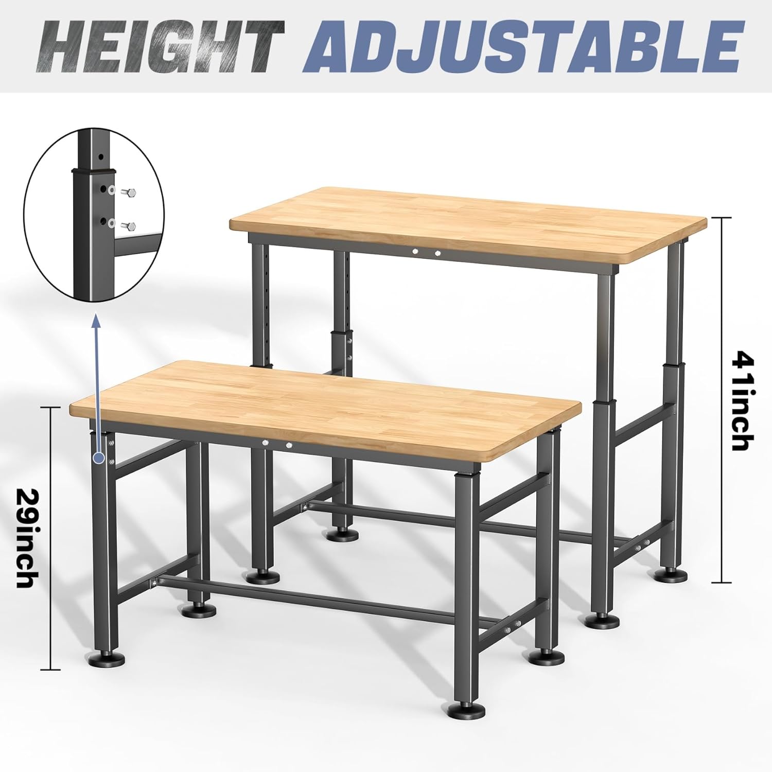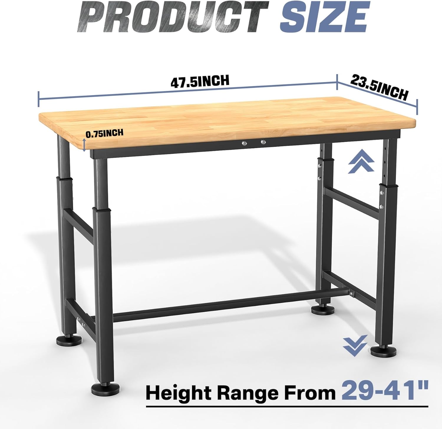 Heavy Duty Adjustable Height Workbench 47.5'x 23.5', Rubber Wood Top Work Table, 2000 LBS Capacity