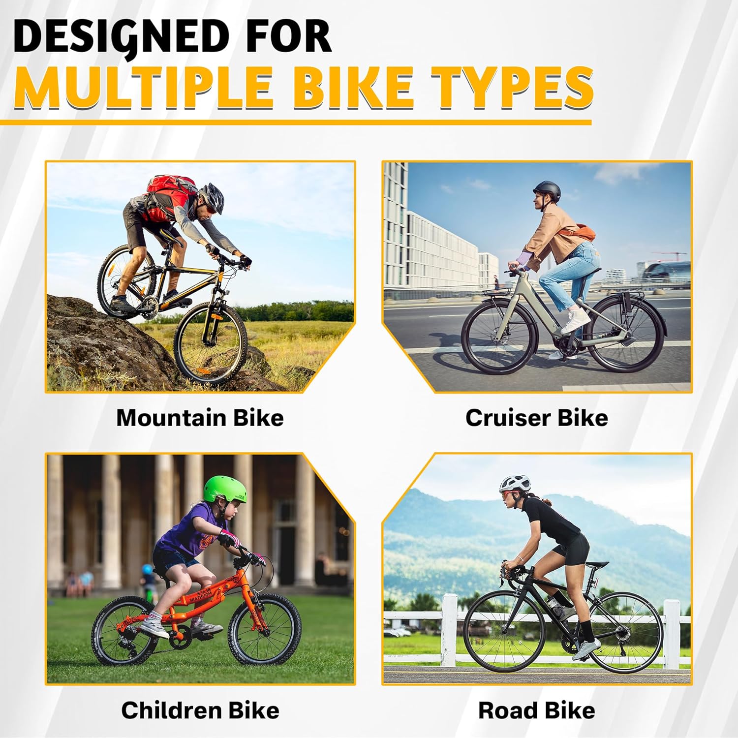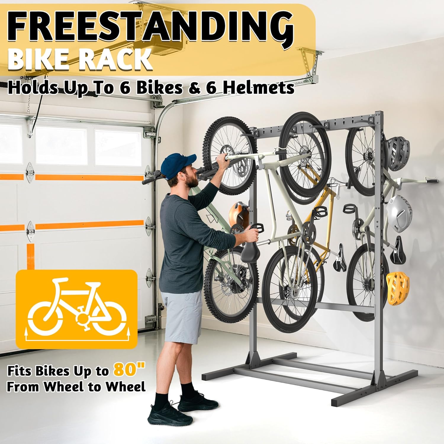 Multi-functional bike rack: Designed for cycling enthusiasts, this rack includes 6 bike hooks and 6 helmet hooks, suitable for mountain, road, kids` bikes, and more. Both sides provide convenient storage for helmets, towels, backpacks, and other gear