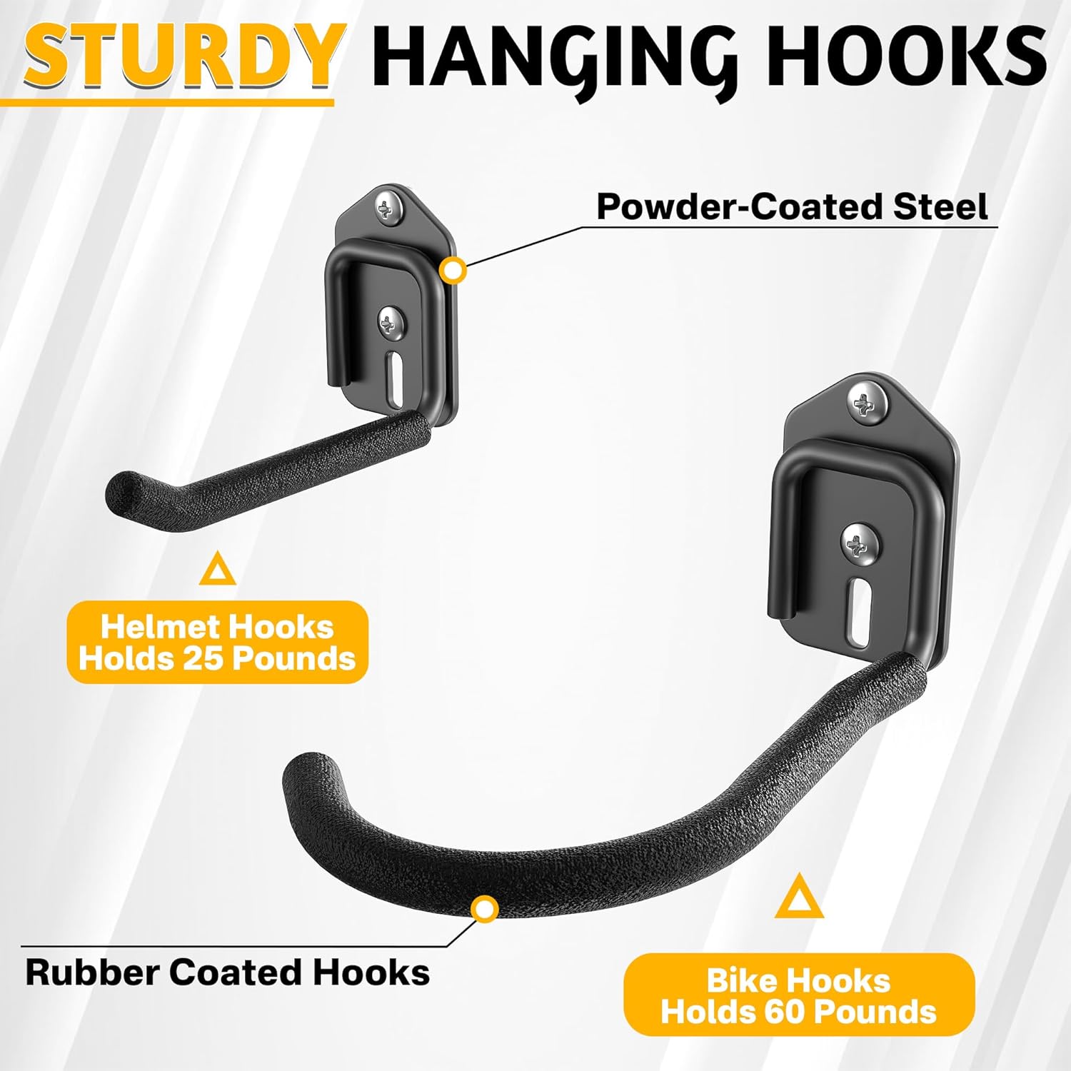 High-Quality Adjustable Hooks: Heavy-duty hooks feature a thick rubber coating to protect and securely hold bikes and gear. Each bike hook supports up to 60 lbs, helmet hooks up to 25 lbs. All hooks are adjustable and easy to reposition or remove