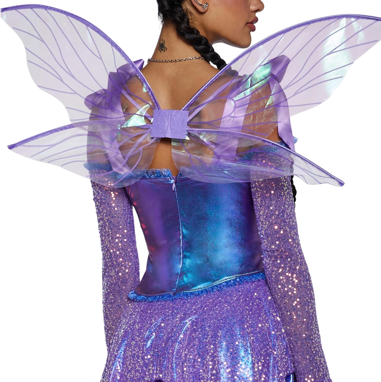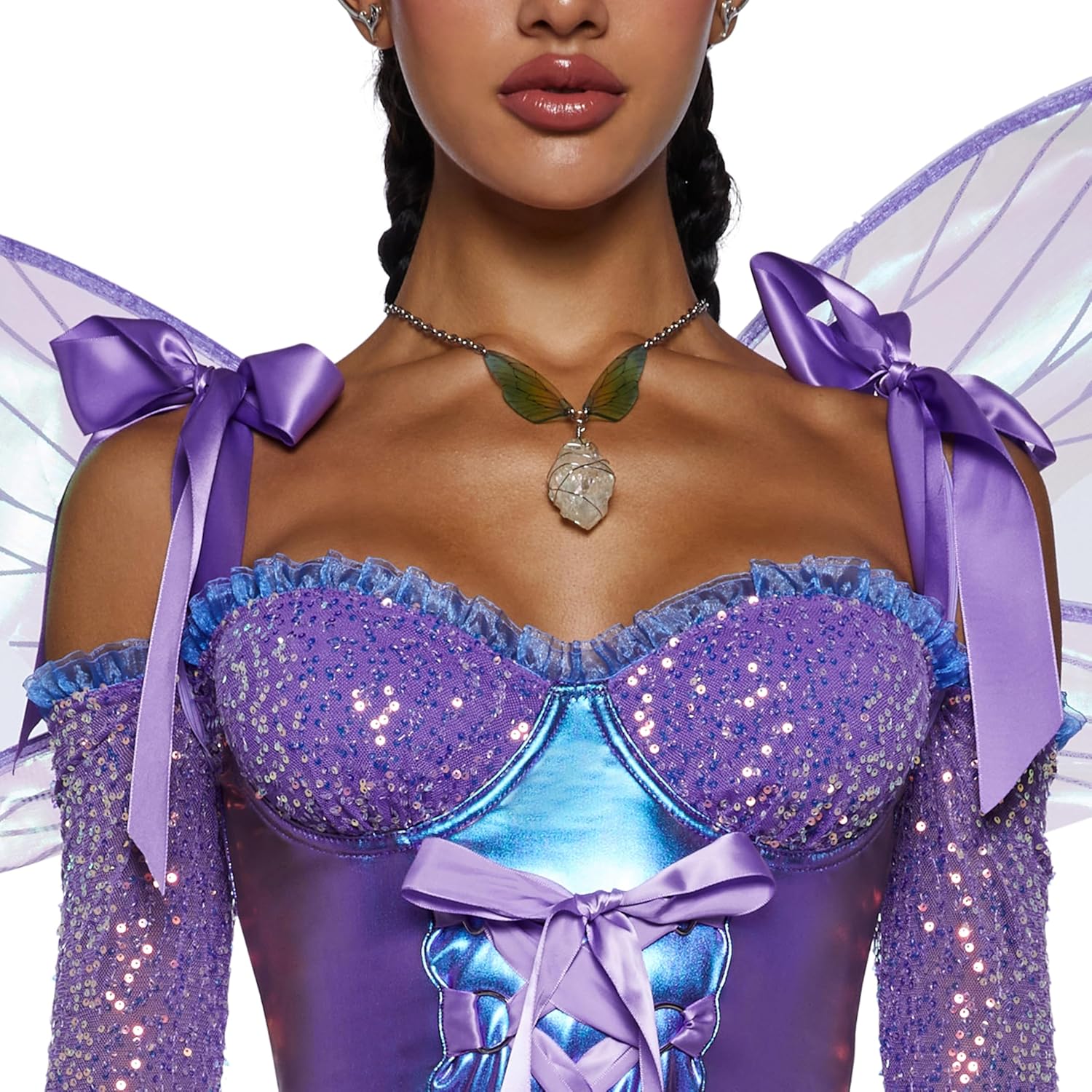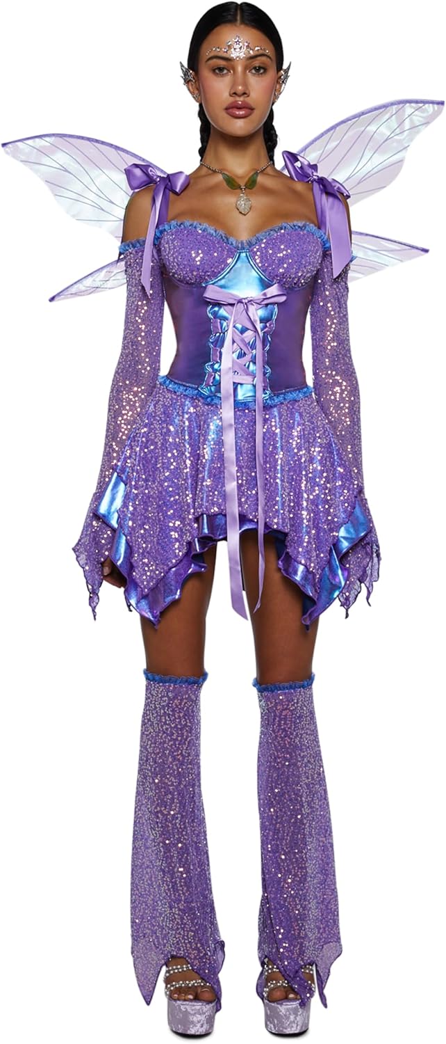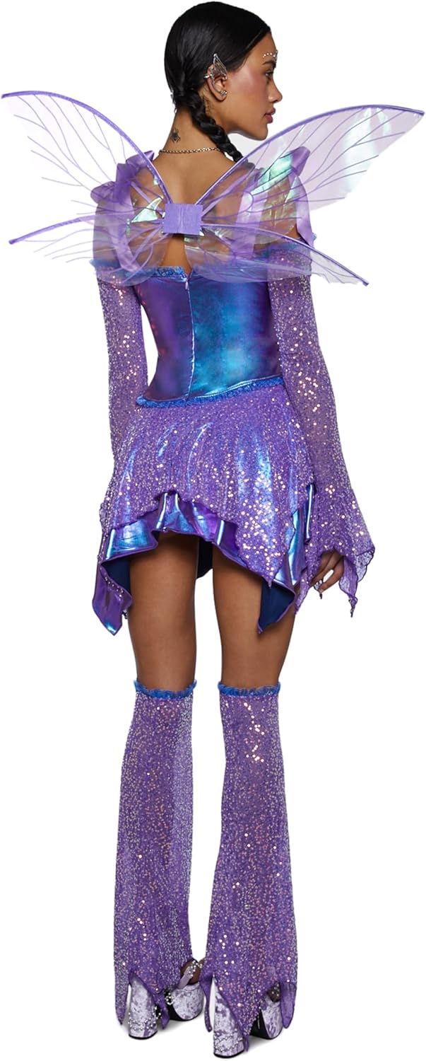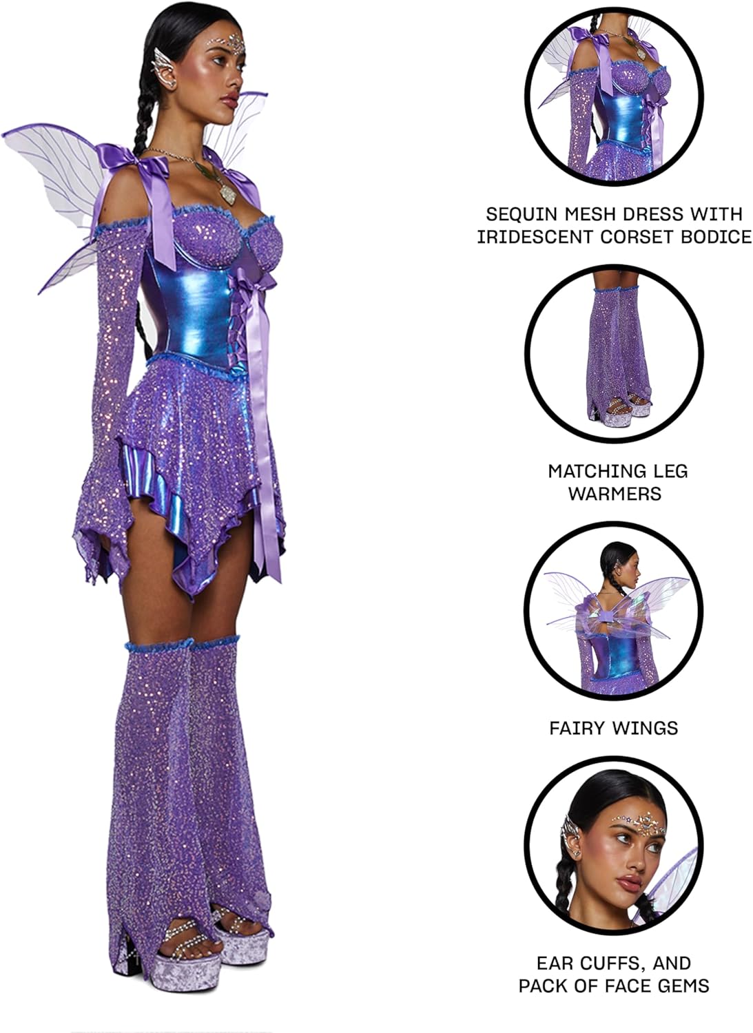 Complete Fairy Look: This set includes a sequin mesh dress with an iridescent corset bodice, fairy wings, matching leg warmers, ear cuffs, and a pack of face gems for a magical ensemble.