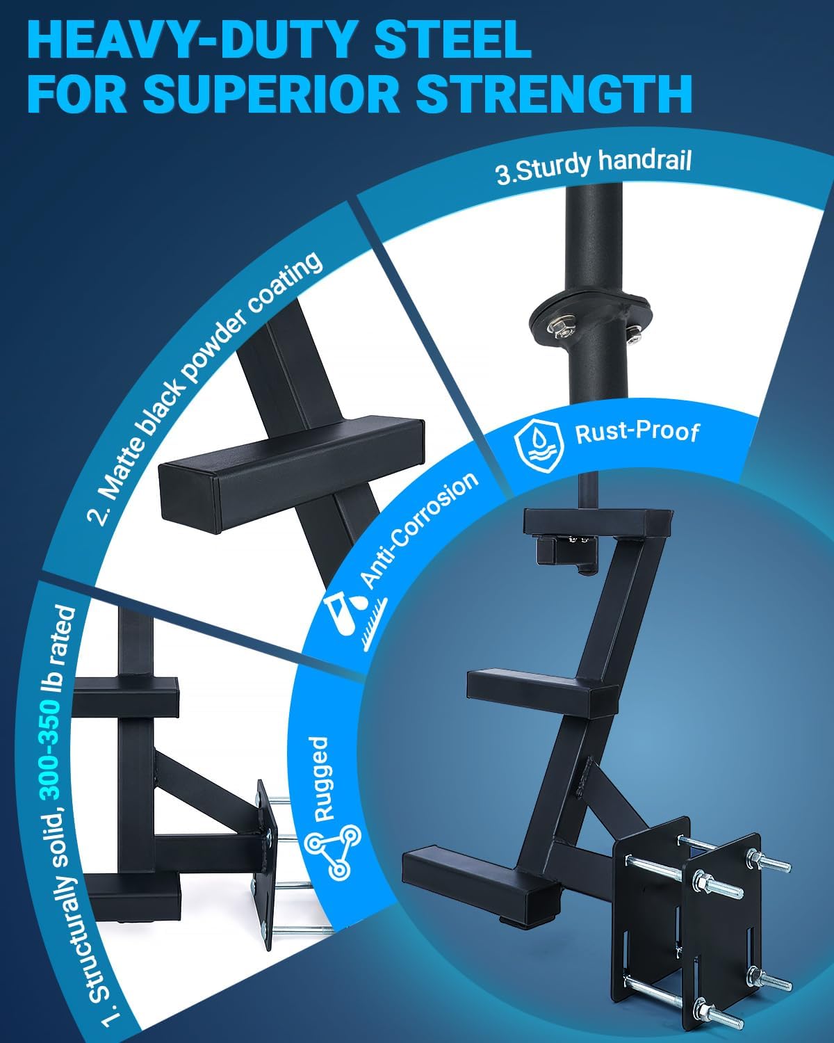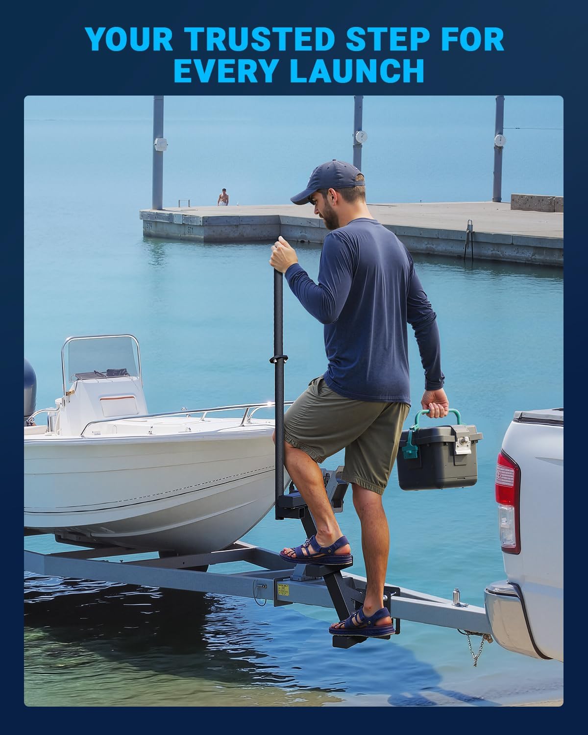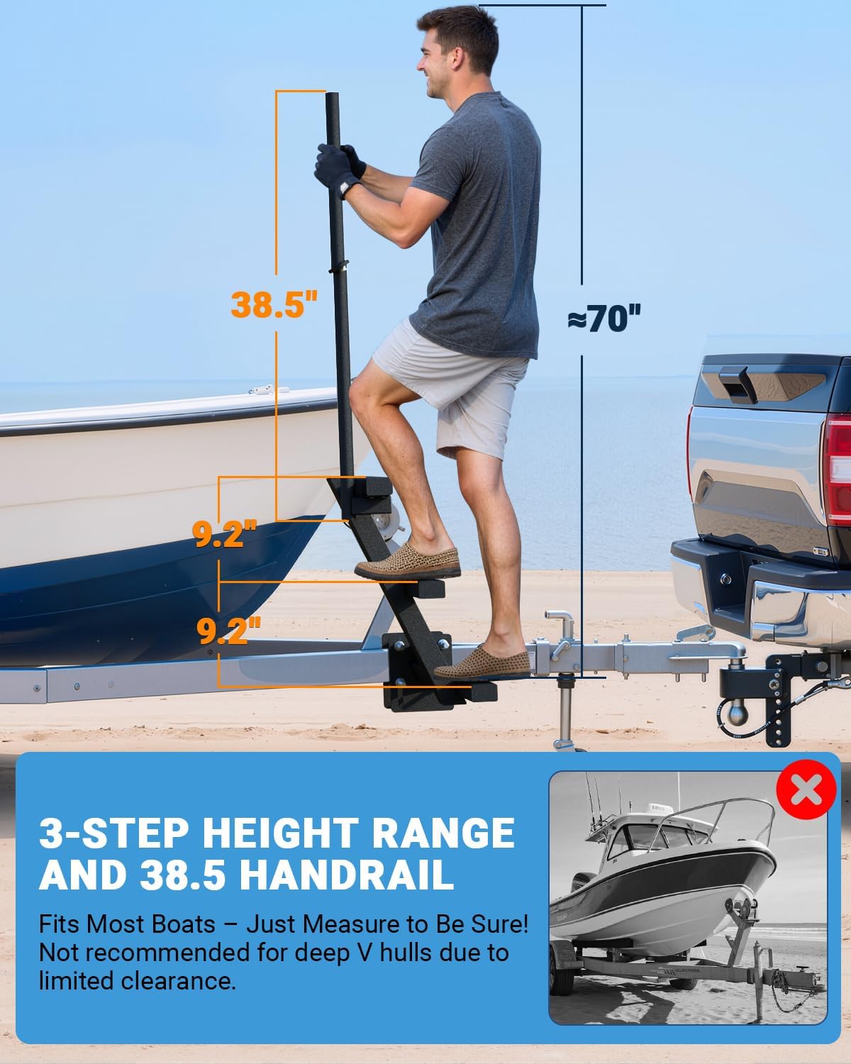 Perfect 3-Step Height Range - With a 38.5\' handrail and 3-step height, these boat trailer steps fit most trailers while keeping every family member safe.