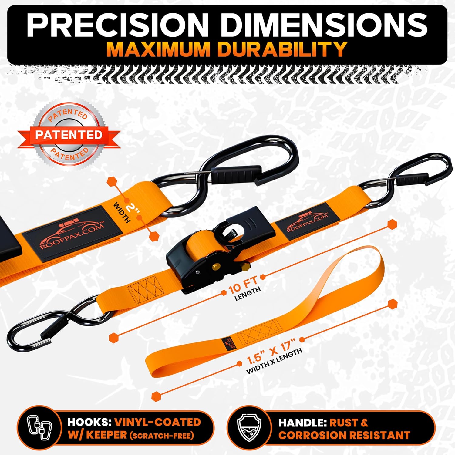 Versatile Patented System: Engineered for versatility with a 3000 lb break strength, our retractable tie-down straps feature a patented system that makes them perfect for securing loads on trucks, trailers, roof racks, and more—ensuring safe travel for all your gear
