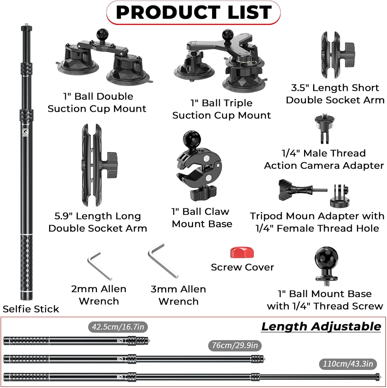 Product List: Aluminum Alloy Extendable Selfie Stick x1, 1\' Ball Double Suction Cup Mount x1, 1\' Ball Triple Suction Cup Mount x1, 1\' Ball Claw Mount Base x1, 3.5\' Length Short Double Socket Arm x1, 5.9\' Length Long Double Socket Arm x1, 1\' Ball Mount Base with 1/4\' Thread Screw x1, Tripod Moun Adapter with 1/4\' Female Thread Hole x1, 1/4\' Male Thread Action Camera Adapter x1, Screw Cover x1, 2mm Allen Wrench x1, 3mm Allen Wrench x1