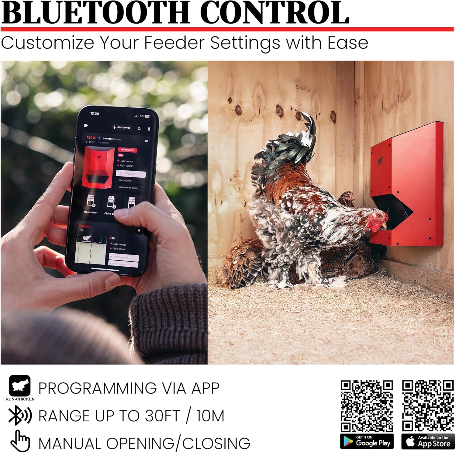 SMART CONTROLLED FEEDING WITH RUN-CHICKEN APP – Take full control of your flock’s feeding schedule with the RUN-CHICKEN App! Program and adjust feeding times, receive updates, and manage settings directly from your smartphone while you’re within a 15-meter range of the feeder. The app gives you real-time control and flexibility, ensuring your chickens are fed on time, every time – all with a simple tap.