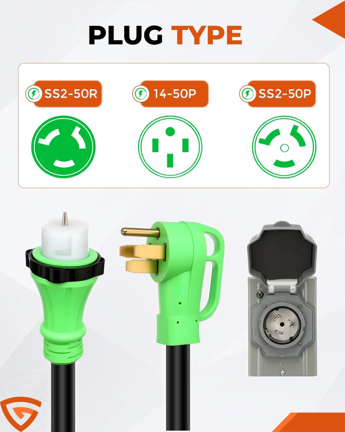High-Capacity & Secure Connection – Rated 125V/250V with STW 6/3 + 8/1 AWG copper wiring, this 50A cord supports up to 12,500W. Equipped with NEMA 14-50P male plug and NEMA SS2-50R twist-lock female connector, ensuring a safe, stable, and reliable power transfer.