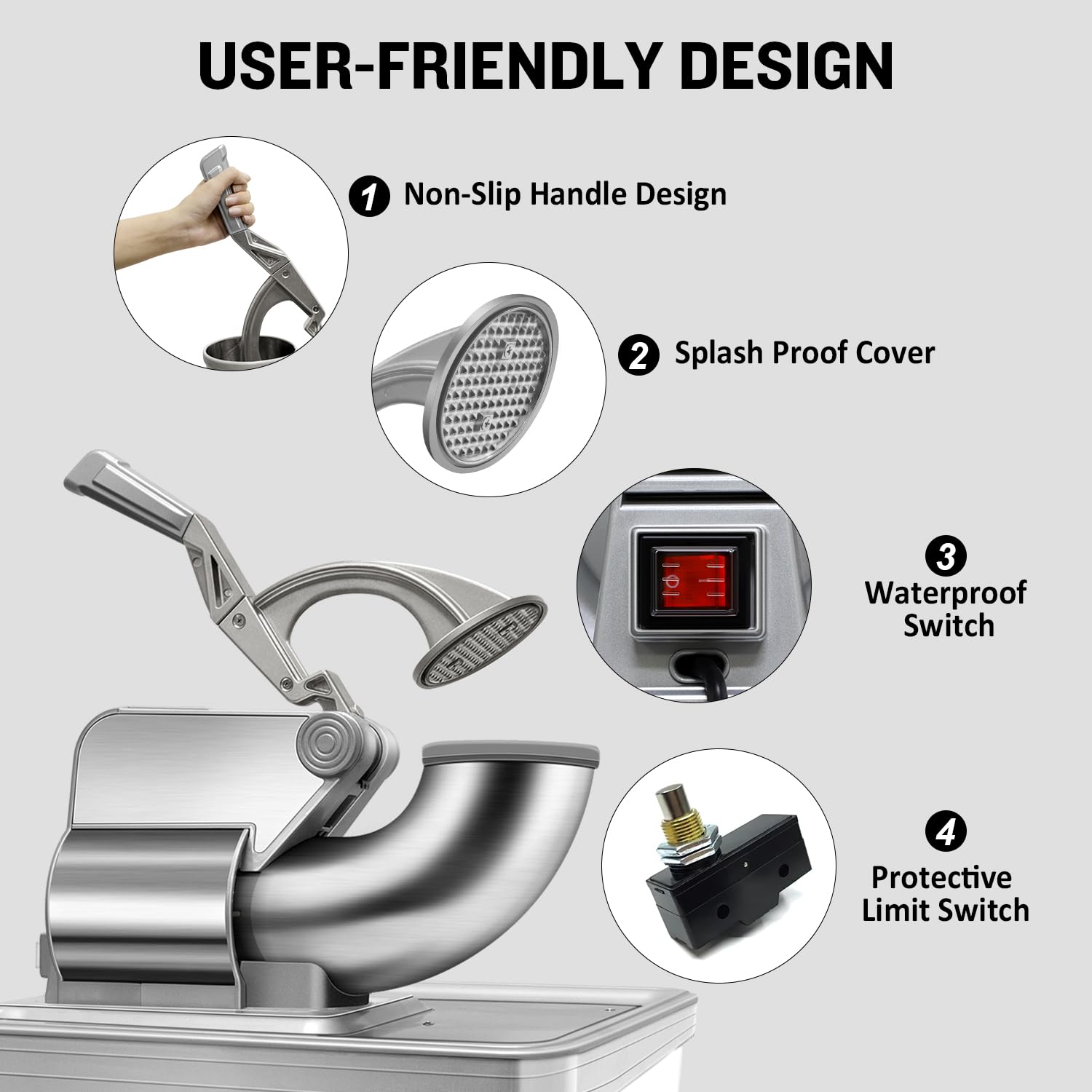USER-FRIENDLY DESIGN- The commercial ice crusher is designed for ease of use, featuring an ergonomic handle that makes operation comfortable and straightforward. In addition, it comes with a waterproof switch for added safety. The one-piece injection-molded PC container and non-slip feet provide stability during use.