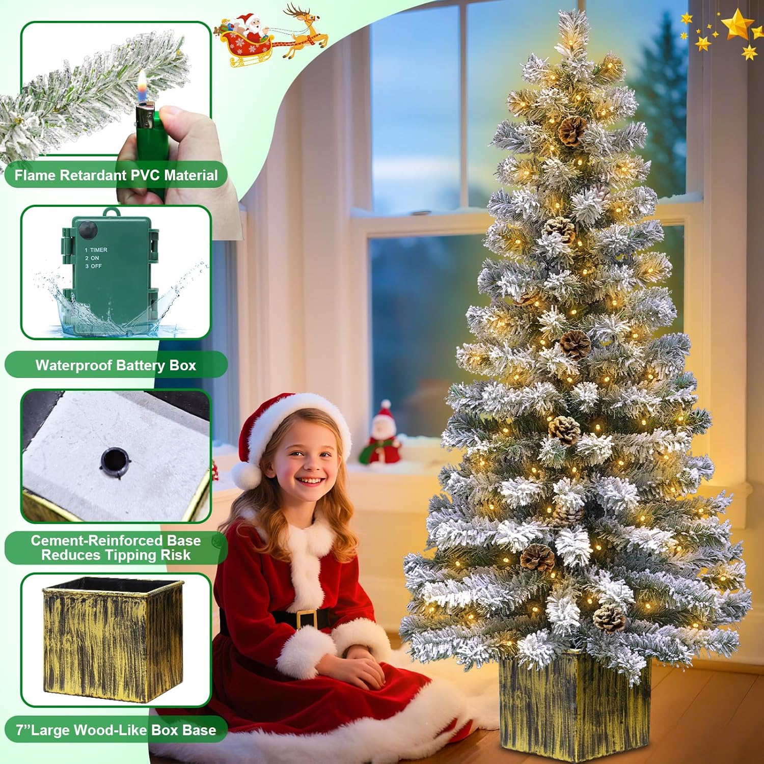 Sturdy and Durable: The 7\'×7\' large base is reinforced with cement, which can help the entryway Christmas decor stand steadily; Made of PVC materials, the branch are flame-retardant and can keep vibrant a long time, a safe and long-lasting festive charm