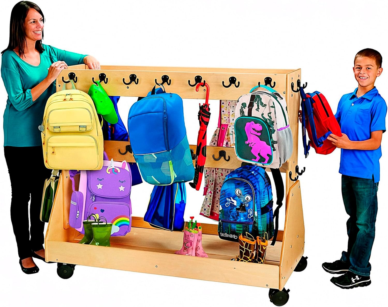 Rolling Backpack cart and Classroom Cubbies for Daycare, Storage with Coat Hooks and Wheels, Wooden