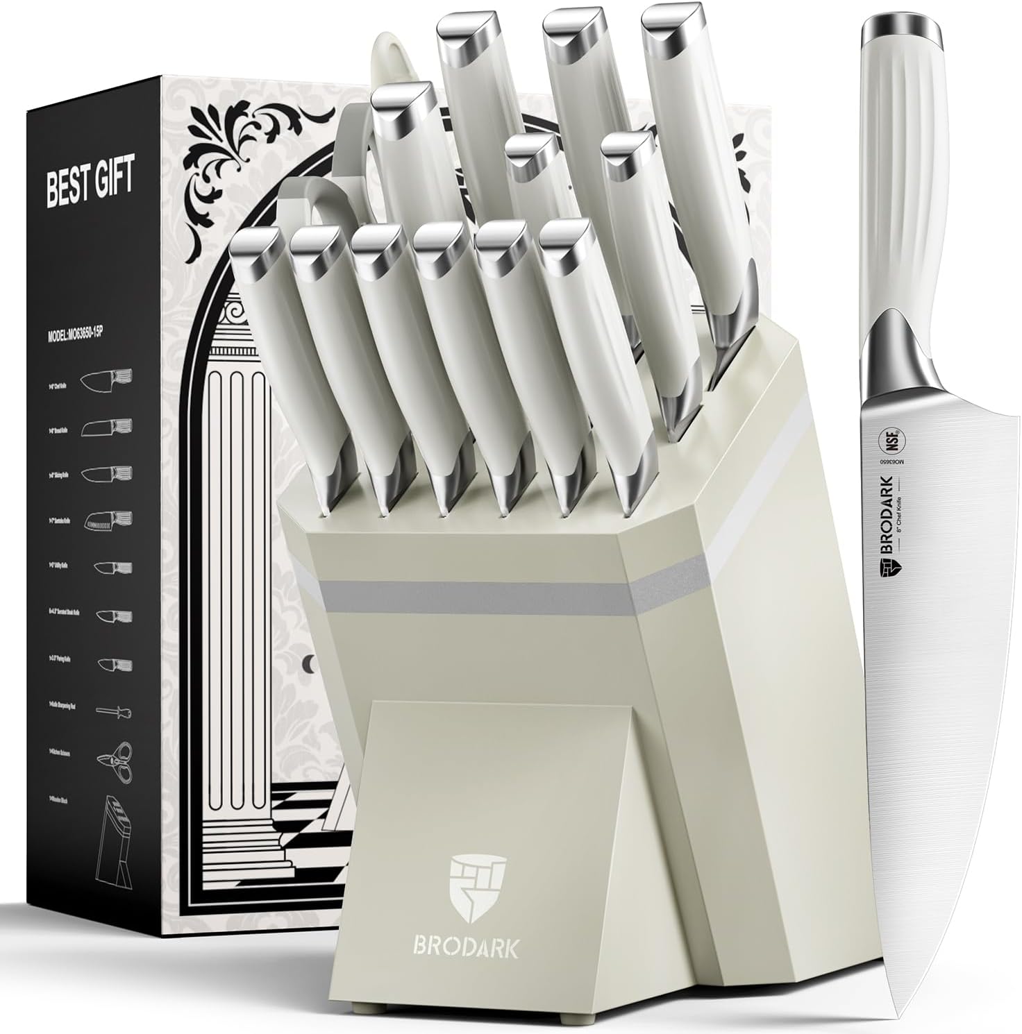 All-in-One 15-Piece Knife Set: Includes everything you need: chef, santoku, bread, slicing, utility, and paring knives, 6 steak knives, kitchen shears, and a sharpening rod. The wood block keeps your knives organized, saves counter space, and avoids messy drawers