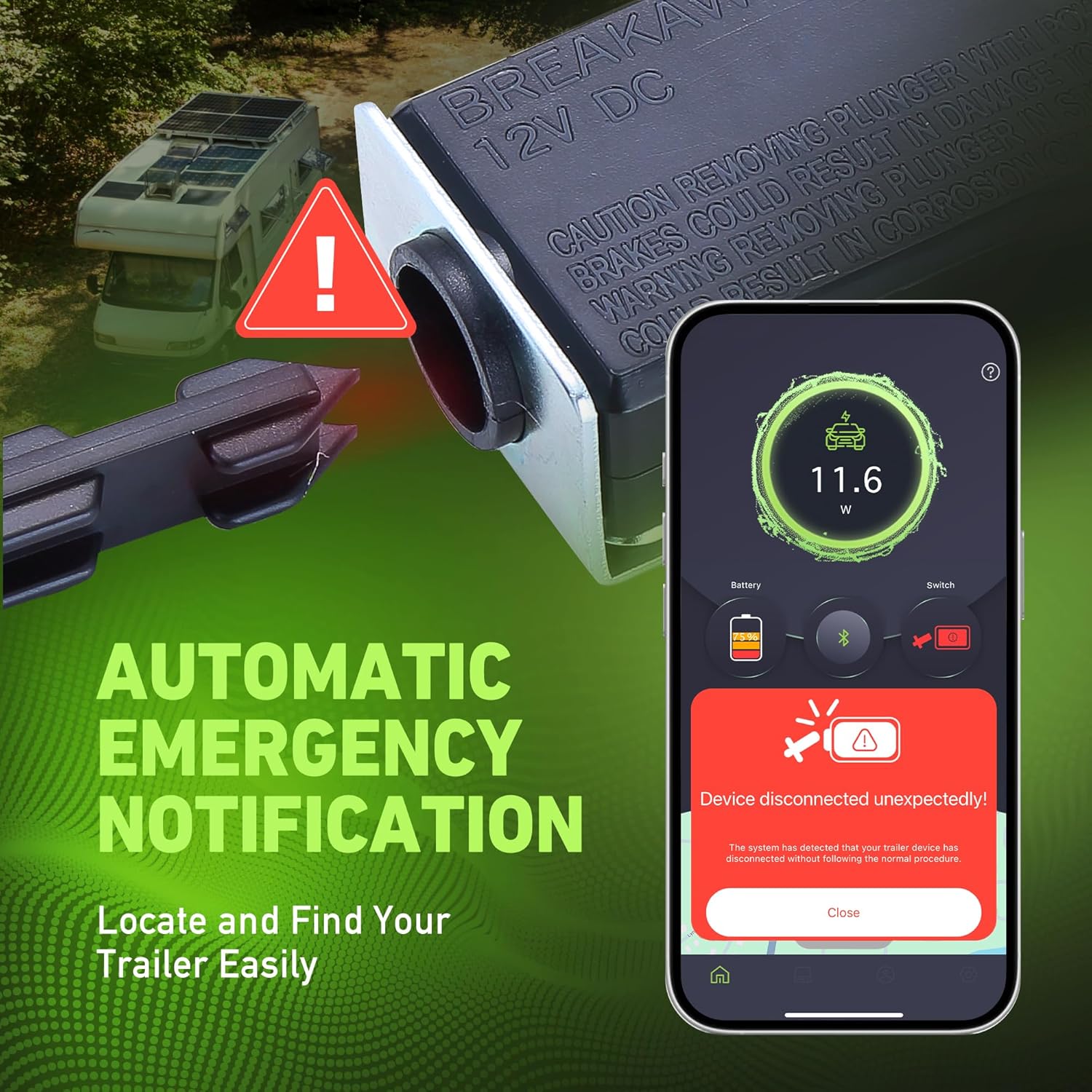 Enhanced Safety & Trailer Finder: Our All-in-One breakaway kit automatically engages trailer brakes in the event of accidental detachment; sends emergency alert; logs GPS location for quick trailer recovery.