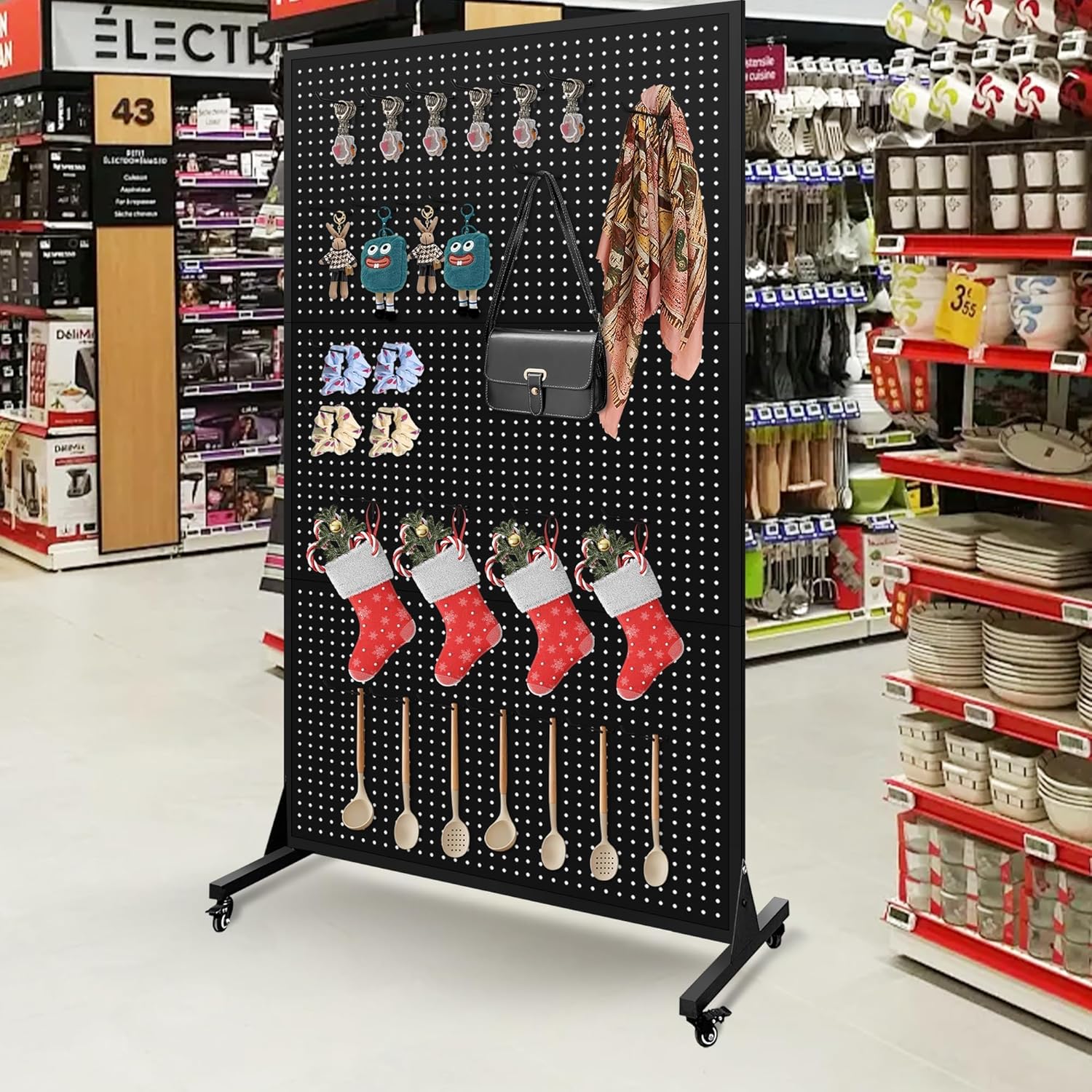 3.5 x 6 Feet Metal Pegboard with 50 Hooks, Wheels, and T-Base, Large Display
