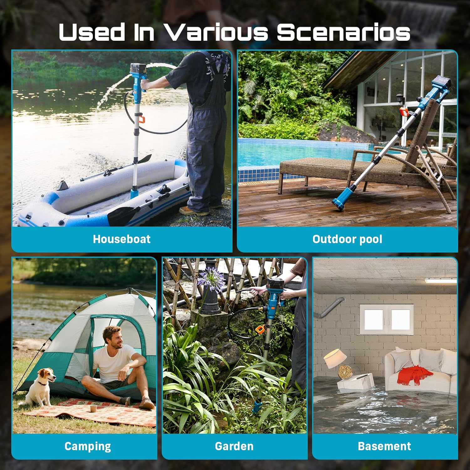 Ultimate Waterproof Durability: Engineered with IPX8-rated pump body (submersible) & IPX4-rated battery (splash-proof), this small water pump thrives in rain, floods, and humid environments. Submerge it, use it, forget corrosion worries.