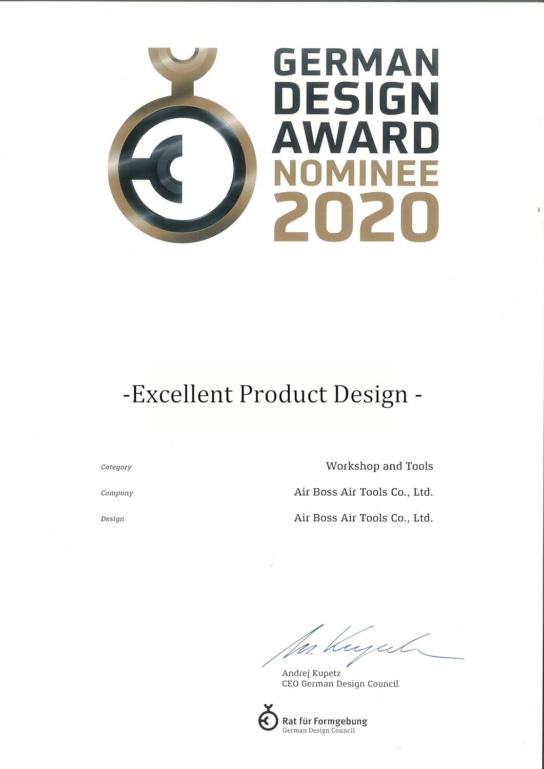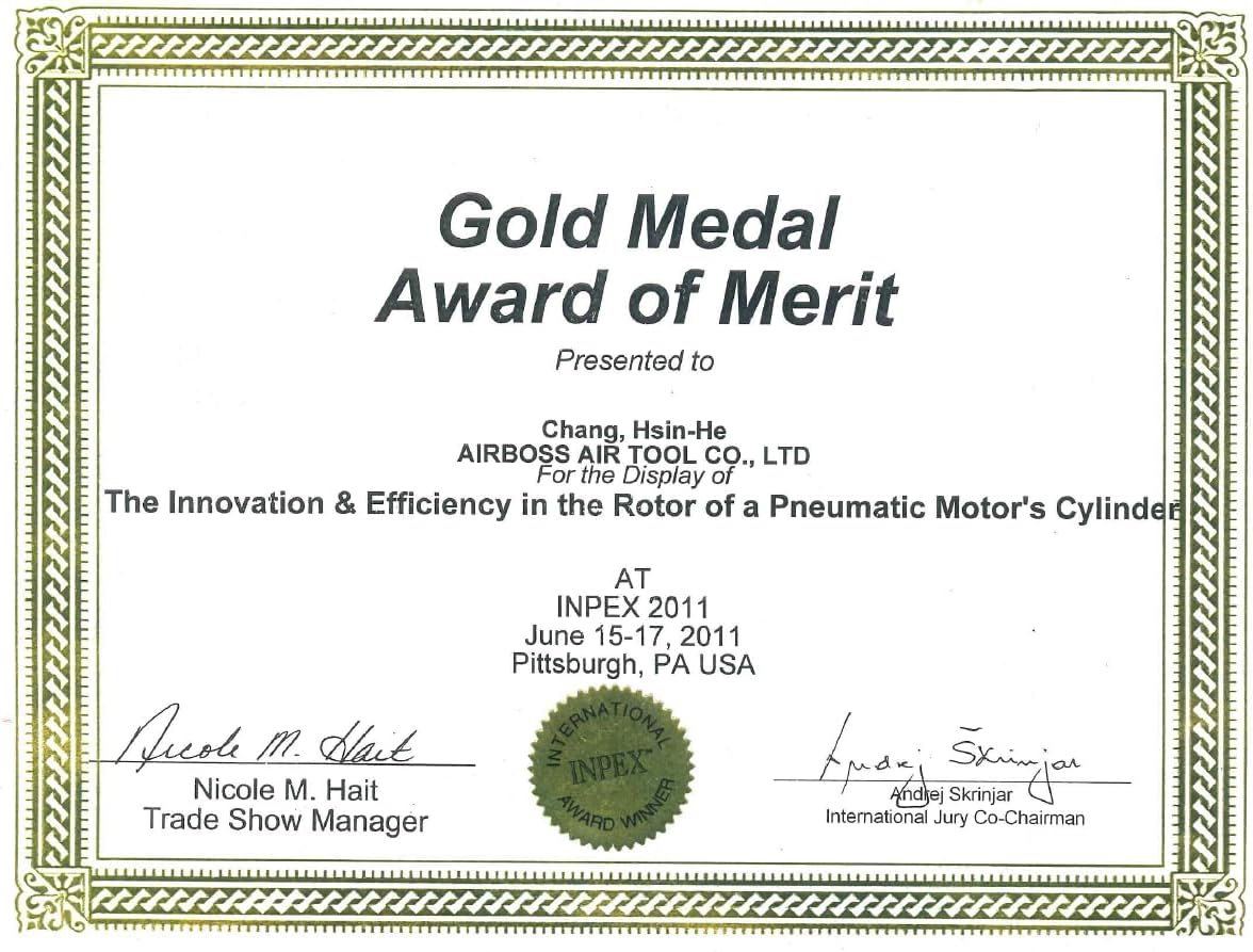 Recognized for Innovation & Design: 2011 INPEX Gold Medal Award of Merit (Pittsburgh, USA) – Recognized for Innovation & Efficiency in Pneumatic Motor Design. 2011 IENA Silver Medal (Nuremberg, Germany) – Honored for Lightweight Air Motor Technology 2020 German Design Award Nominee – Acknowledged for Excellent Product Design in Workshop and Tools