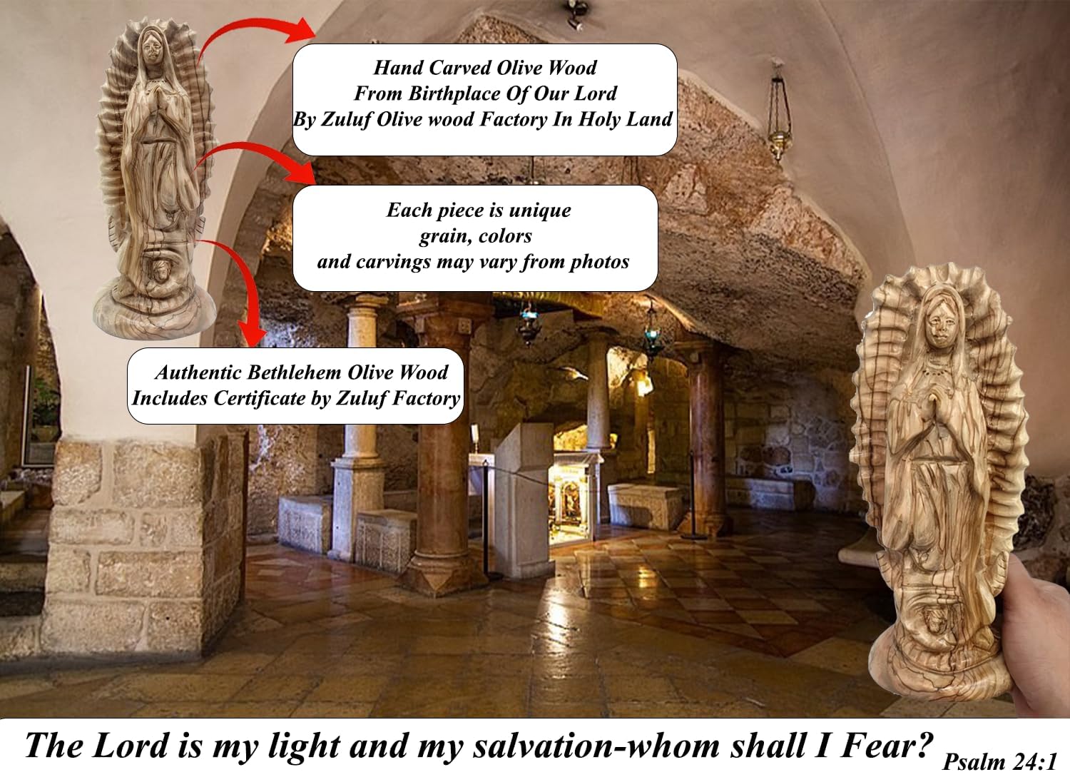 Our Lady of Guadalupe Statue: Hand carved olive wood Virgin Mary, made in Bethlehem; centerpiece for Catholic altar, Christmas, or spiritual home décor