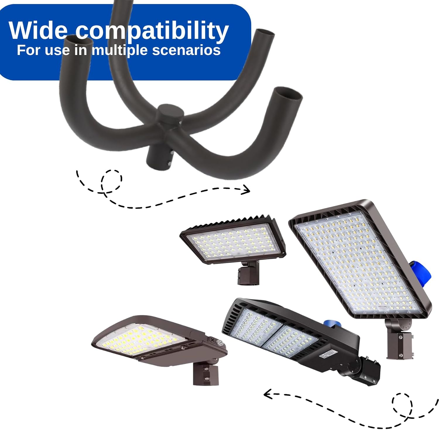 More Efficient Lighting Layout: The unique 4 Bullhorn arm shape enables broader illumination. By slip fitter the fixture onto the tenon, precise parking lot light beam positioning can be easily achieved, while providing 360° uniform, shadow-free daylight
